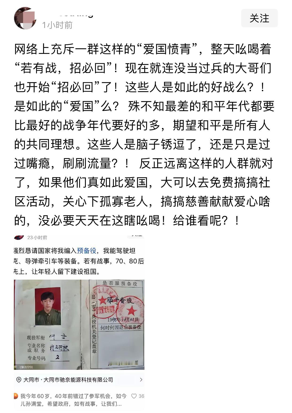“若有战,招必回”是愤青? 自愿上前线是好战? 最差的和平年代比最好的战争年代要好? 有些人自己跪久了就看不得别人站起来,自己不敢说就认为别人说的都是假话,如果这个作者是70后80后,那就是忘记历史,如果他是00后,那就是不懂说出这话的人为什么要加一句让年轻人留下建设祖国,因为对很多中年人都有一个刻在骨子里的执念:中国人好不容易过上的好日子,不允许任何人干涉,尤其是日本。