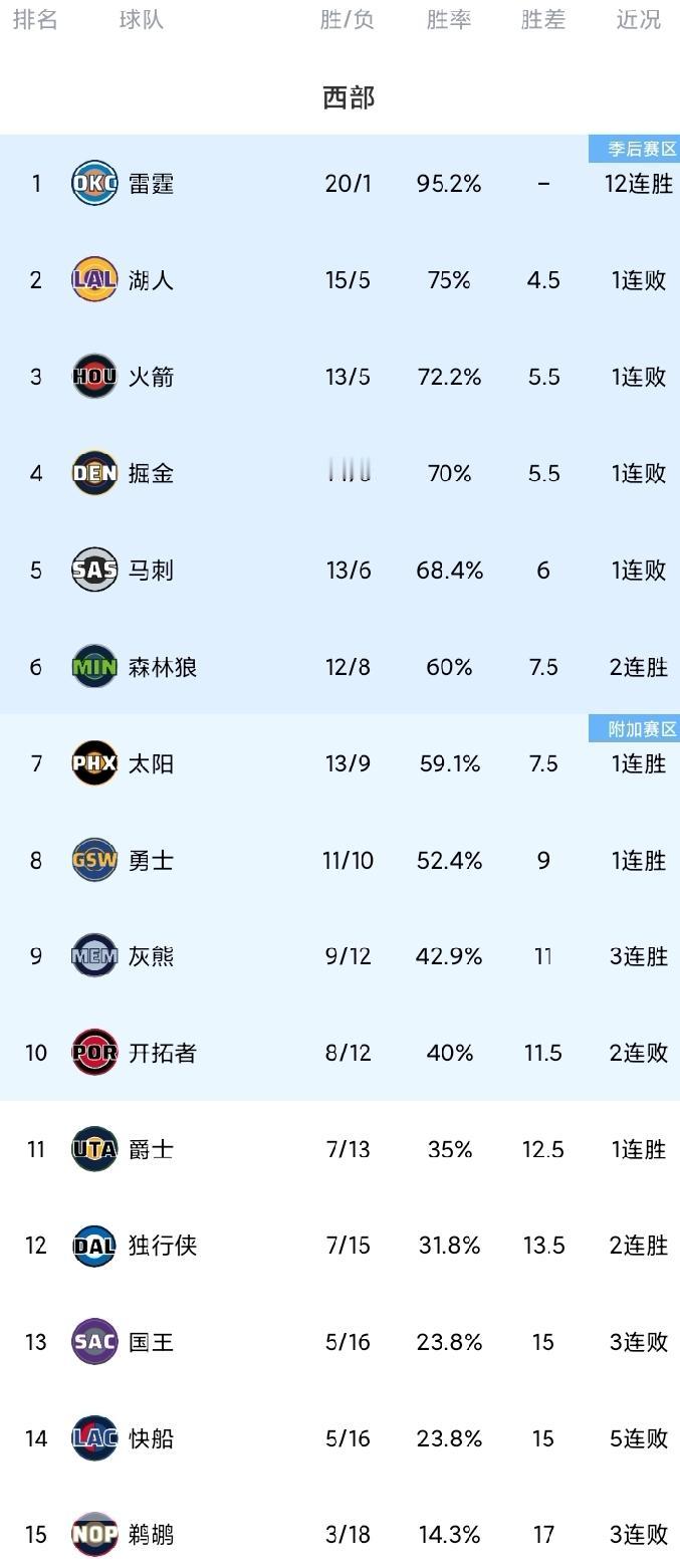 冷门频传!湖人火箭掘金皆爆冷,快船惨遭5连败,西部最新排名。 湖人7连胜期间,击败的对手目前胜率没有一个达到五成,所以湖人战绩有水分的嫌疑一直都在。今日终于碰上一个胜率超过五成的球队,太阳队赛前12胜9负,而且遭遇两连败。然而在布克仅打了约10分钟伤退的前提下,湖人遭闷头一棒,竟然最多时落后24分,最终108-125终止7连胜。东契奇38分9失误,里夫斯16分5失误,詹姆斯低迷10分3失误,好在保住了连续第1294场得分上双的纪录。 火箭与爵士二番战,火箭队有些太大意了,有些把比赛想当然了。双方首次交锋,火箭轻轻松松28分大胜。再次对决,火箭队在防守上,比赛态度上,下降了不止一个档次,爵士投篮50%,三分40%,而火箭44.1%与29.4%,最终125-133惨遭爵士复仇。对阵弱旅,该赢的比赛没能拿下来,这一点相比雷霆差了好多。此外,谢波德被提升先发后明显不适应,近四场比赛只有一场得分上双,本场只有9分,末节更是被DNP! 爆冷的不只有火箭,还有掘金,121-131不敌独行侠。约基奇拼尽了全力,空砍大号三双,29+20+13,但是挽救不了球队糟糕的防守,本场再次至少丢了130分,过去5场比赛掘金场均丢125分,战绩2胜3负,戈登与布劳恩的缺阵对掘金队的防守影响太大了。此外独行侠这边,克莱有走出低迷的架势,上一场对阵快船得到23分,本场15分,这也是克莱连续第5场比赛得分上双,场均16.6分4.2记三分球,三分命中率50%,这还交易吗? 要说西部比鹈鹕更惨的球队,快船一定榜上有名,双方目前是难兄难弟,一个排名第14,一个第15。在快船123-140不敌热火,吃到五连败的同时,过去16场输了14场,说兵败如山倒也不为过。而且五连客刚刚开始,还有老鹰灰熊森林狼火箭在等着虐菜。紧接着是灰熊雷霆湖人火箭开拓者与活塞,所以若快船不能尽快找回状态,提升士气与球员信心,遭遇10+连败也有可能,到那时快船真的没救了。 西部最新排名,如下图。湖人掘金火箭同时输球,雷霆第一的位置更稳了。快船再输真的可能跌至倒数第一,雷霆队能笑醒。