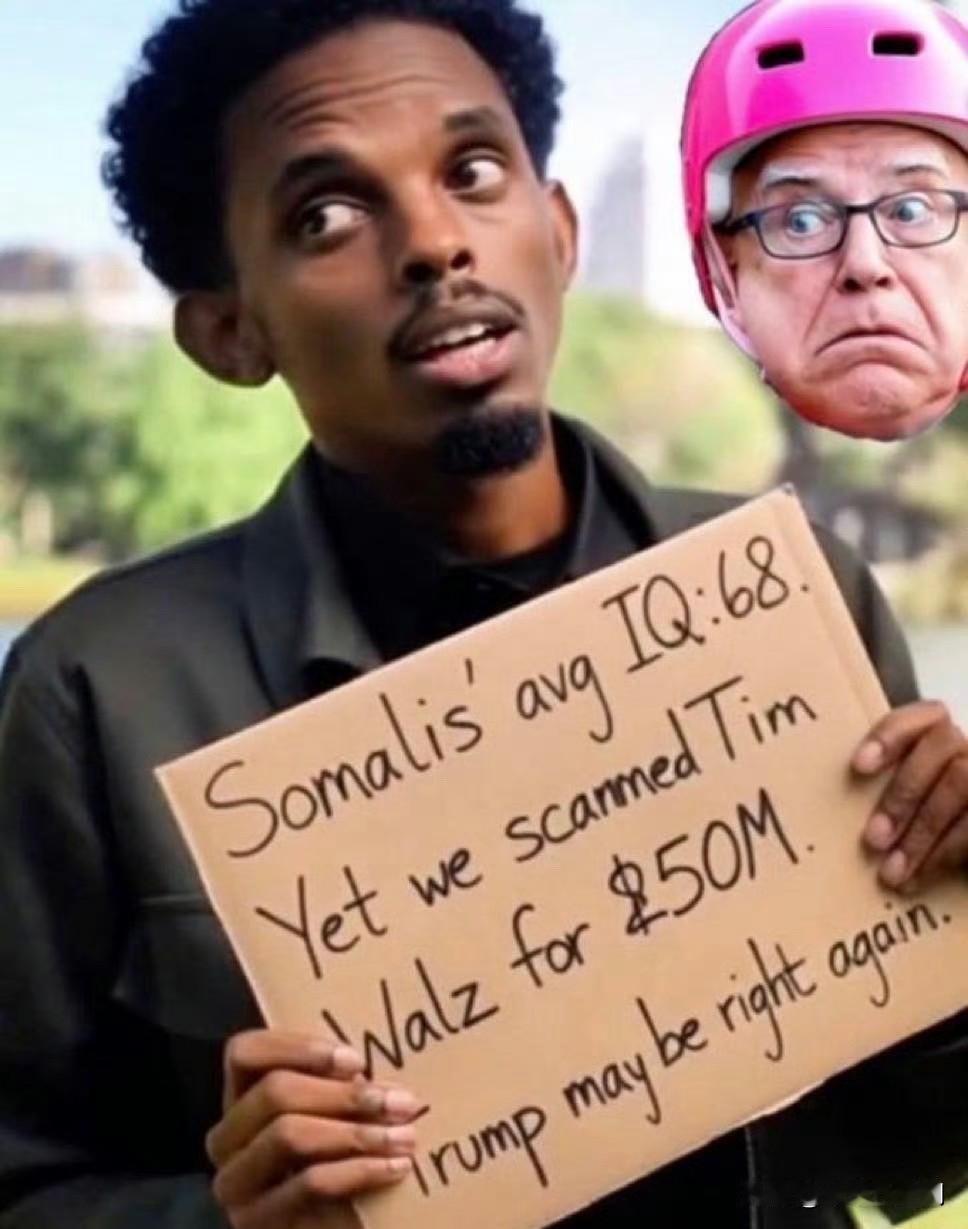 索馬利人的平均智商為68。但是我們從TimWalz那里騙了5千萬,川普可能說對了(川普說Tim是個低智商的白痴)。