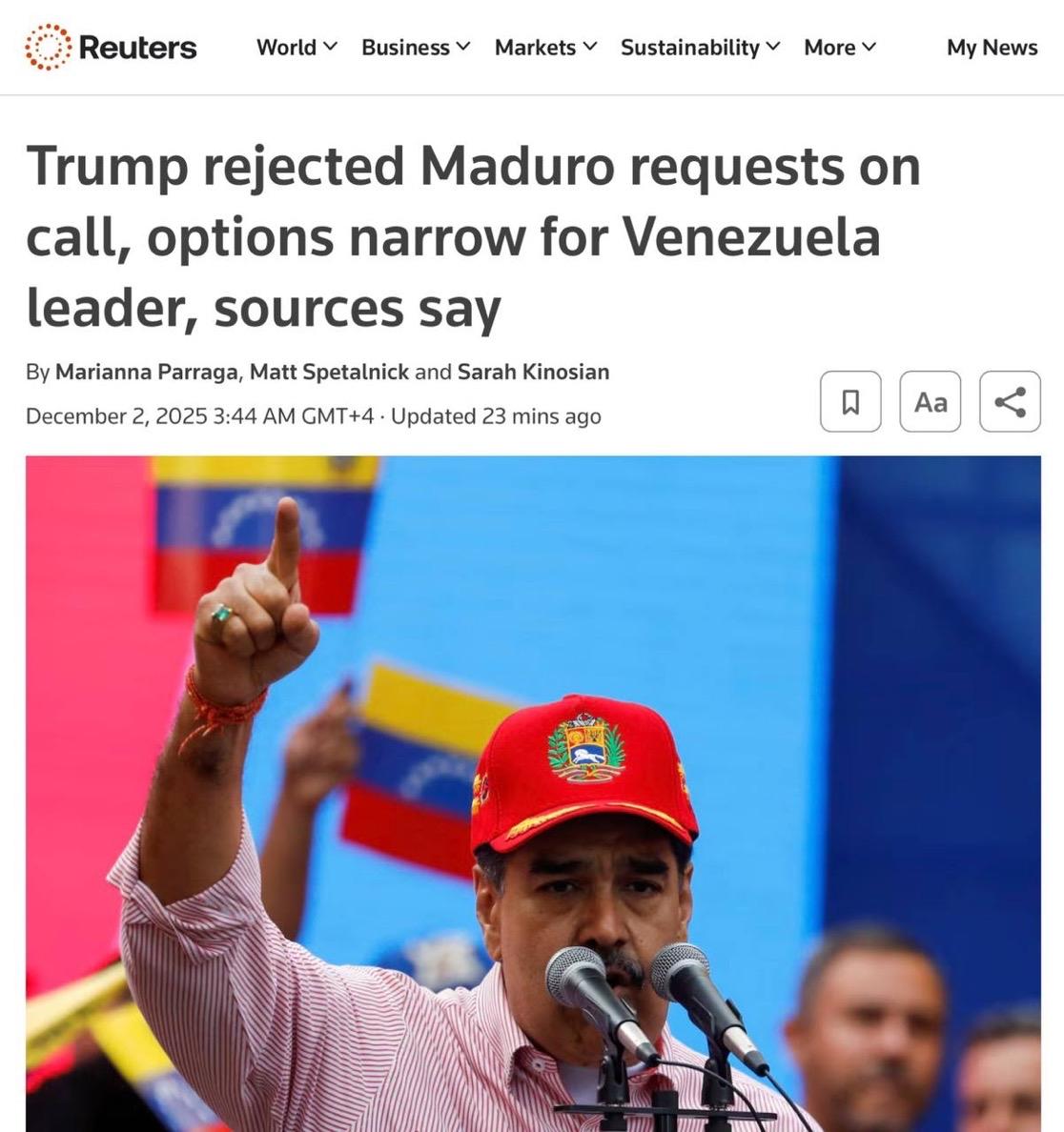 ⚡️特朗普曾给马杜罗下达最后通牒,要求他在上周五之前带着家人离开委内瑞拉。 据该机构援引的两名消息人士称,正是由于这一“安全走廊”期限到期,才促使特朗普在周六宣布关闭委内瑞拉领空。 此前,美国总统表示马杜罗的执政时间已屈指可数,同时坚称华盛顿无意与这个拉丁美洲国家开战。