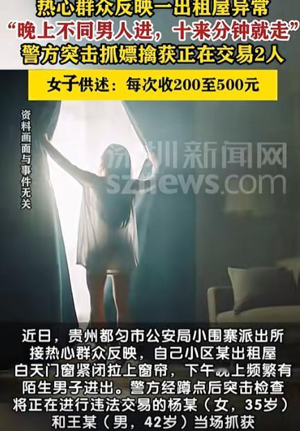 贵州一男子晚上回家,发现邻居家不断有陌生男子进出,而且白天门窗紧闭,拉上窗帘,他怀疑里面有猫腻,直接报警了!警方接到举报后,直接突击检查,果然在房间里发现一对男女,正在进行违法交易,2人被当场抓获。 贵州都匀市小围寨街道的东风小区,是一栋建成近二十年的老旧居民楼,没有电梯,没有智能门禁,邻里之间低头不见抬头见,日常作息和生活轨迹彼此都颇为熟悉。 正是这样一个人情味浓厚的小区,近期却因三楼一间出租屋的异常状态,打破了往日的平静。 居住在小区六年的李大哥,是退休后闲不住的热心人,每天早晚都会在小区里散步,顺便留意楼栋里的大小情况。 一个多月前,三楼那间空置了半个月的出租屋迎来了新租客,一名自称杨某的35岁女子。 从杨某搬入的第二天起,李大哥就发现了不对劲。 这栋楼的住户大多是老年人或上班族,白天总会有人开窗透气,晾晒衣物,可杨某的房间却常年拉着厚厚的深色窗帘, 哪怕是三伏天最闷热的午后,门窗也紧闭着,连一丝缝隙都不留,从外面完全看不到屋内的动静。 更反常的是生活痕迹的缺失,李大哥每天路过三楼门口,从没见过门口有快递盒、垃圾袋。 也从没见过杨某出门买菜、购物,甚至连下楼倒垃圾的身影都没出现过,这与正常住户的生活状态格格不入。 真正让李大哥提高警惕的,是傍晚时分的规律性场景。 每天下午五点半左右,天刚泛起暮色,就会有陌生男子陆续出现在小区门口。 这些男子的停留时间都严格控制在十分钟到半小时之间,离开时从不走小区正门,而是绕到西侧的狭窄后门,那里没有监控,鲜少有住户经过。 李大哥悄悄统计过,最多的一天有七名陌生男子进出,且没有一张重复的面孔,这种高频次、短停留、避人耳目式的往来,让他越发确定事情不简单。 东风小区此前曾发生过小偷入室盗窃的案件,之后社区就一直宣传“邻里守望”,鼓励居民发现异常及时上报,李大哥也记着社区民警的叮嘱,遇到可疑情况不要轻易声张,先观察再反映。 于是,他连续观察了一周,详细记录下这些男子的进出时间、穿着特征、行为习惯,甚至留意到有男子敲门后,会先对着手机念一串数字,里面才会有人回应开门。 无奈之下,李大哥拨通了都匀市小围寨派出所的报警电话,接线民警听完后,当即表示会安排人员核查。 接到报警的当天下午,两名便衣民警就来到了东风小区,他们没有直接上门,而是在小区对面的商铺二楼找了个隐蔽位置蹲守,同时联系社区网格员,调取了小区最近一个月的公共区域监控录像。 为了避免打草惊蛇,民警没有立即行动,而是持续蹲守了两天,摸清了杨某的作息规律。 她白天基本不出门,所有生活物资都通过外卖平台订购,外卖员送货时也只开一条门缝取餐,从不露面。 掌握这些关键信息后,派出所制定了突击检查方案。 第三天晚上七点,正是陌生男子进出的高峰期,四名民警分成两组,一组守住小区前后门,一组携带执法记录仪上楼敲门。 听到敲门声后,屋内迟迟没有回应,民警亮明身份并告知“再不开门将依法破门”,里面才传来慌乱的脚步声,过了近十分钟,门才缓缓打开。 民警进门后,看到屋内光线昏暗,茶几上摆放着多叠现金,一名女子和一名男子神色慌张地站在客厅,正是35岁的杨某和42岁的王某。 面对民警的询问,两人起初辩称是朋友聚会,可当民警拿出监控录像和社交软件聊天记录截图时,两人再也无法抵赖,如实供述了卖淫嫖娼的违法事实。 经查,杨某老家在外地,无固定职业,偶然间发现老旧小区出租屋监管宽松,便萌生了利用出租屋从事违法交易的想法。 于是她通过多个社交软件发布隐晦招揽信息,标注“单次两百起,地点隐蔽”,吸引有需求的男子联系。 王某是通过其中一款社交软件找到杨某的,当天刚交易完就被民警查获,两人此前并不相识,纯粹是金钱交易关系。 目前,杨某和王某已被警方依法行政拘留,案件正在进一步办理中,依据《治安管理处罚法》第六十六条规定,两人将面临五日以上十五日以下拘留,并处五百元以上五千元以下罚款。 这起案件也引起了社区的重视,东风小区随后启动了出租屋专项整治行动,要求房东必须提供租客身份证复印件和联系方式,签订《出租屋治安责任保证书》,同时在小区前后门加装了高清监控,在楼道内张贴了治安举报电话。 房东图省事忽视租客信息登记,最终不仅要面临罚款,还可能影响后续的出租权益。 而李大哥的行为,正是“邻里守望”最生动的体现,他没有因为怕麻烦而选择沉默,而是用细心观察和及时举报,维护了小区的治安环境。 这起事件也给所有人敲响了警钟:老旧小区并非法外之地,违法行为再隐蔽也逃不过多方监管。 房东出租房屋不能只图租金,必须尽到监管责任。 只有多方携手,才能让违法分子无处遁形,让每个小区都能成为安心居住的港湾。 如果各位看官老爷们已经选择阅读了此文,麻烦您点一下关注,既方便您进行讨论和分享,又能带来不一样的参与感,感谢各位看官老爷们的支持!