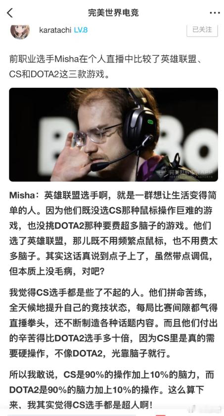 Misha对于LOL、CS、DOTA2三款游戏的定义,我感觉Dota2说的还挺对的,10%的操作加90%的脑子,dotadota2cs2LOL