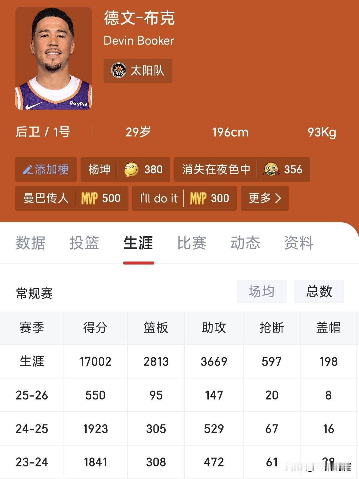 恭喜布克生涯总得分超过17000分,如果不是伤病,也许他早就超过两万分了吧!目前NBA历史上总得分超过17000分的只有107人。下一位能达到这个里程碑的约基奇了,他目前总得分有16789分,最快会在元旦前完成,毕竟211分如果顺手也许就五六场比赛而已。