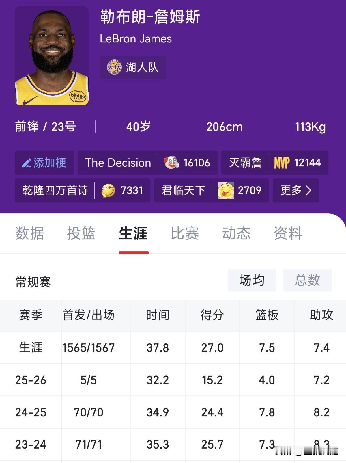 不服老不行呀!本赛季詹姆斯出战5次,场均得分15.2分4篮板7.2助攻,得分和篮板都是生涯最低,今天要不是强行得分双上,估计还会更低。 科比最后一个赛季出场66次场均得分是17.6分3.7篮板2.8助攻,本赛季不确定是不是詹姆斯最后一个赛季,你们觉得本赛季詹姆斯数据比科比好吗?