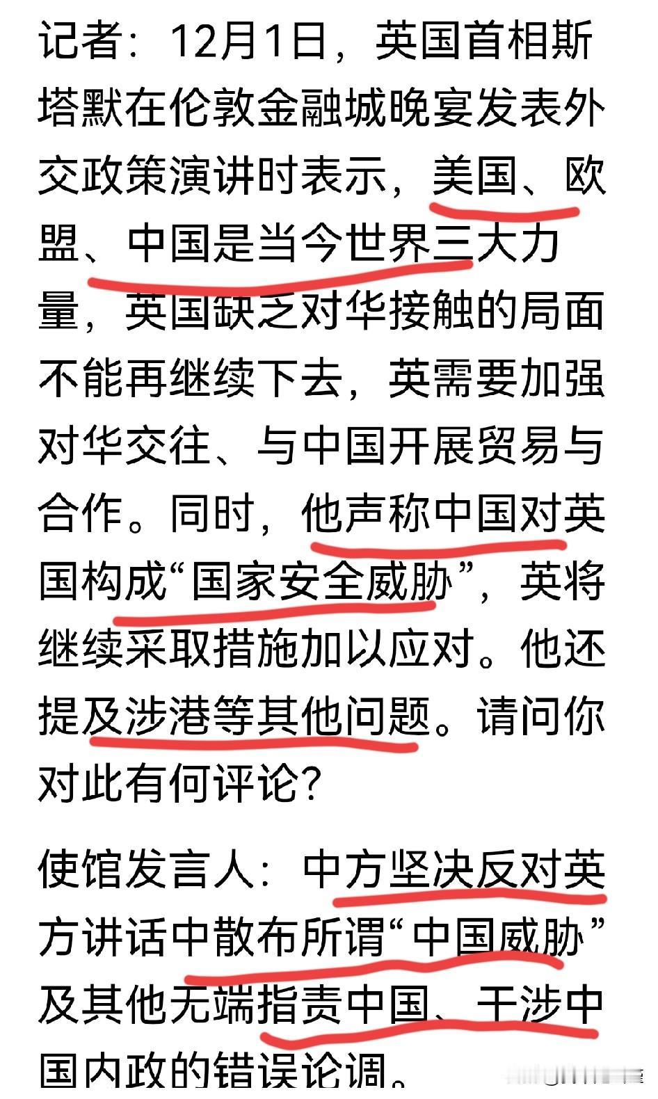 号称“🌅”帝国的英国又来刷存在感了。 英国首相斯塔默在干晚饭的时候发表了演讲,既当又立的表示,需要和中国加强合作,然后话锋一转又表示“中国威胁论”,并提及涉港话题。 能不能说他是不是糊涂了,这么健忘吗!香港早就回到祖国怀抱了,还开口闭口拿香港说事,你有那资格吗? 作为曾经的老牌帝国,号称日不落,但从现在的世界格局来看,这家伙早已经黄昏了。那为啥还要这么高调的说几句呢?纯粹就是刷刷存在感,以免大家真把它忘了! 以前自己当老大,现在只能给别人当小弟。这心里落差估计让他们受不了,所以就时不时的出来吠几声,也算有个交代! 纵观英国近代史历史,也就丘吉尔和撒切尔比较出名,一个是因为二战,一个是因为大家都叫她铁娘子,但别忘了,铁娘子也有摔跤的时候,大家可曾记得?! 英国 英国帝国 英国衰败之辩 英国问题 英国那些事 斯塔默夫妇 英国强硬表态