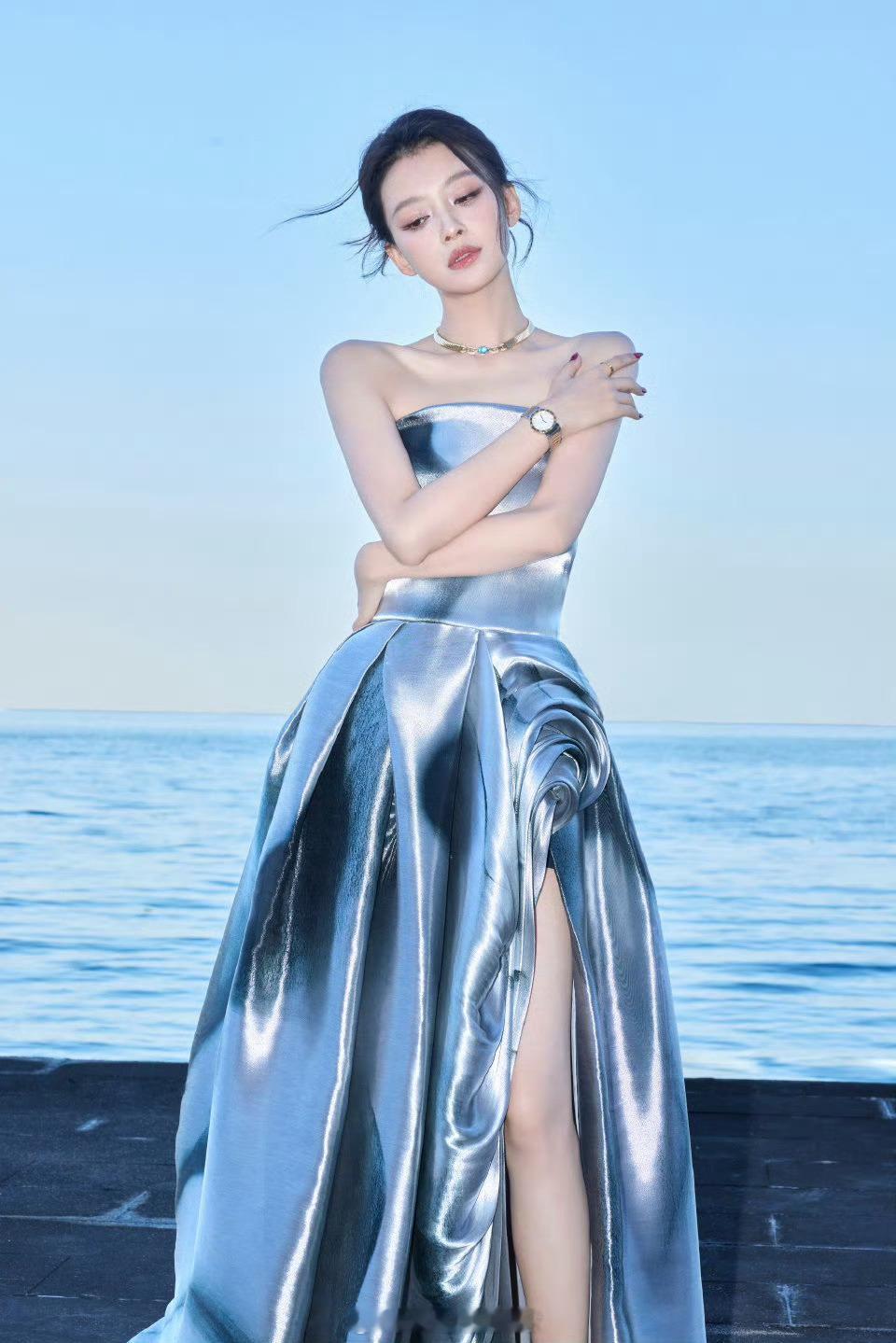 孙怡怎么把海浪穿在身上孙怡海边银色抹胸缎面长裙,给造型师加🍗啊