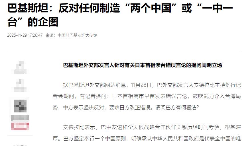 巴基斯坦给日本的压力要比俄罗斯还大!11月28日巴基斯坦外交部发言人安德拉比表示,巴方反对任何制造“两个中国”或“一中一台”的企图。 就在日本忙着搞小动作、试图模糊“一个中国”原则的时候,巴基斯坦的这番表态虽没有直接点日本的名,却字字句句都冲着日本近期的涉台挑衅而来,立场鲜明且毫无模糊空间,对日本而言比应付俄罗斯还要棘手。 俄罗斯对日本的反对向来直接硬核,11月里扎哈罗娃三次发声,从批评高市早苗涉台言论“危险”,到谴责日本不反省历史,再到揭露其部署进攻性武器、甘当美国“军事棋子”,每次都是正面硬刚,把话说得明明白白。 但日本对这种直接对抗早就有了应对套路,要么装聋作哑,要么扯着“自卫”的幌子辩解,反正硬顶就能混过去。 可巴基斯坦的路数完全不同,它不跟日本正面交锋,而是站在国际共识的立场上亮明态度。 日本最心虚的就是自己“言行分裂”的毛病,嘴上反复说“对台立场一贯”,可当中方追问它具体是什么立场时,却始终不敢正面回应。 巴基斯坦这种不指名道姓、却精准契合中方立场的表态,正好戳中了日本的软肋。它要是反驳,就等于承认自己在搞“两个中国”的小动作;要是不反驳,就等于默认了巴方的指责,让自己在国际上丢面子。 更让日本头疼的是,巴基斯坦的表态不是孤立的,紧随其后老挝、柬埔寨、哥伦比亚等多国纷纷重申一个中国原则,形成了国际社会的普遍共识,把日本架在了尴尬的位置上。 日本本来还想在国际上扮演“和平使者”,结果巴基斯坦这波“温和却坚定”的表态,让它的虚伪面具被悄悄撕开。在G20峰会上,日本官员急着辩解中方指责“毫无根据”,却不敢回应巴方及多国的立场表态,这种进退两难的窘境,可比面对俄罗斯的直接批评难受多了。 毕竟硬刚能摆姿态,可这种被国际共识“软牵制”的局面,才是真的让日本无从下手,你说这压力能不大吗?