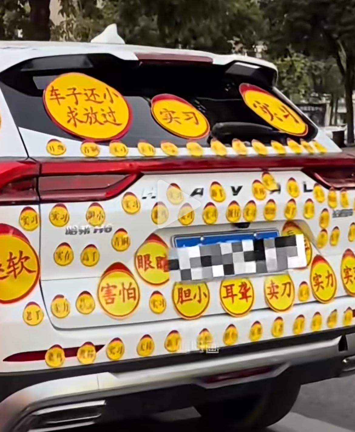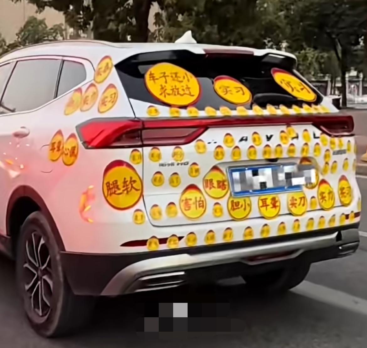 遇到这样的车子,是卖实习贴车贴的吗? 是不是太多了,贴这东西也得要好久吧?