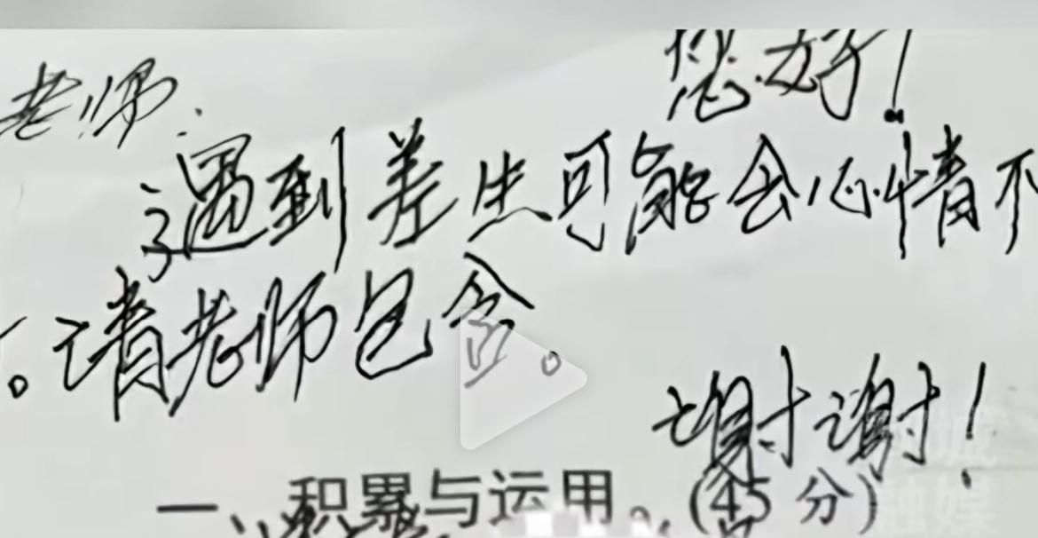 孩子考了44分,爷爷在试卷上给老师写了一段话致歉,爷爷写的是:遇到差生可能会心情不好,请老师包涵。 这个留言让老师很感动。老师是除了你的家人以外最希望你好的人,这句话让老师看到了家长对老师的认可和支持。看到了家长对老师的善意。 这个孩子父母外出打工,和老一辈的人在一起生活,老人照顾着他的生活起居已经很不容易了,对孩子的学习肯定无暇顾及。有些孩子小,自制力比较差,课堂上容易走神,成绩就不是很乐观。 社会上还有很多留守儿童,真该多关注下他们!!!