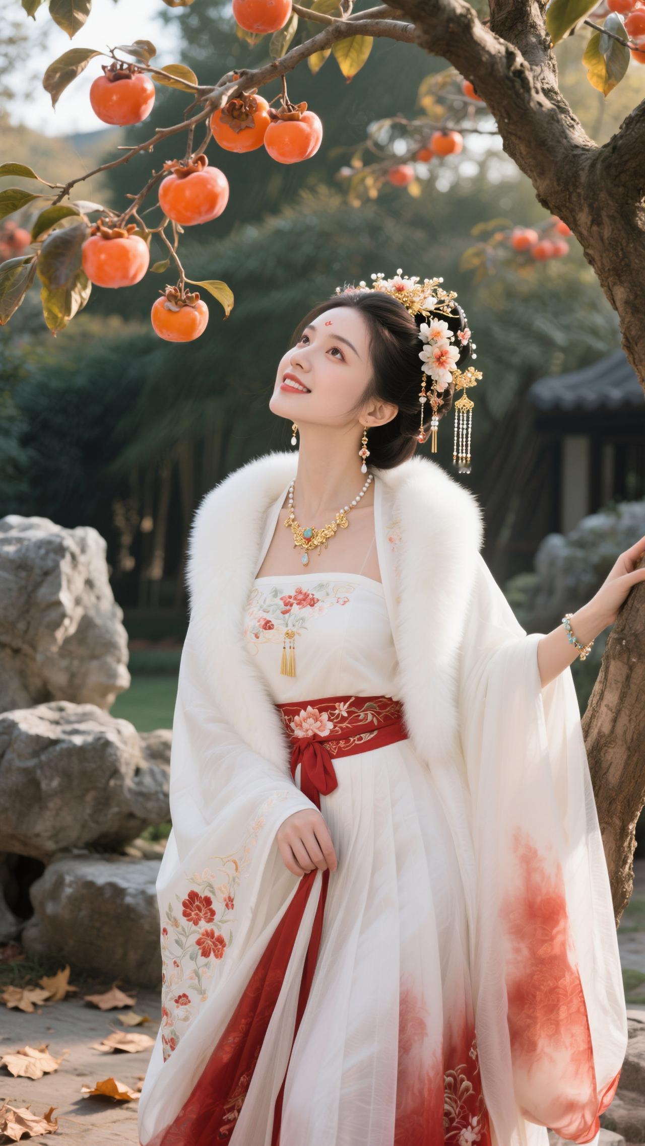 鹧鸪天·柿下惊秋 云鬓金钗缀玉柔,白裘香裹一痕羞。 霜阶石冷苔侵袖,秋柿红温指触柔。 花钿浅,坠珠流,枫痕沾袂意偏幽。 低眉笑捻风前叶,偷拾闲光入鬓头。