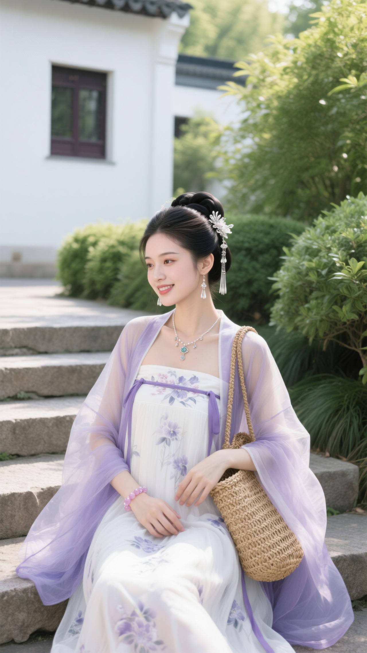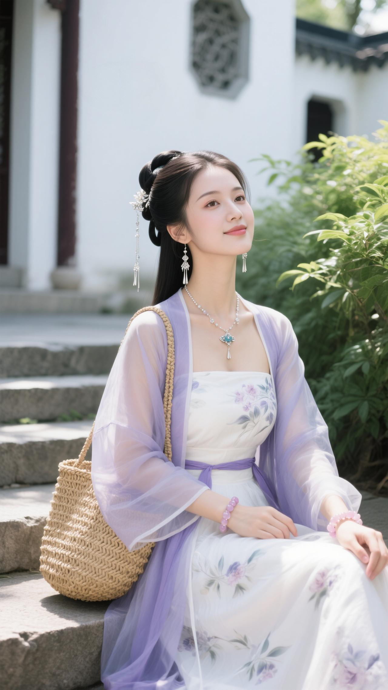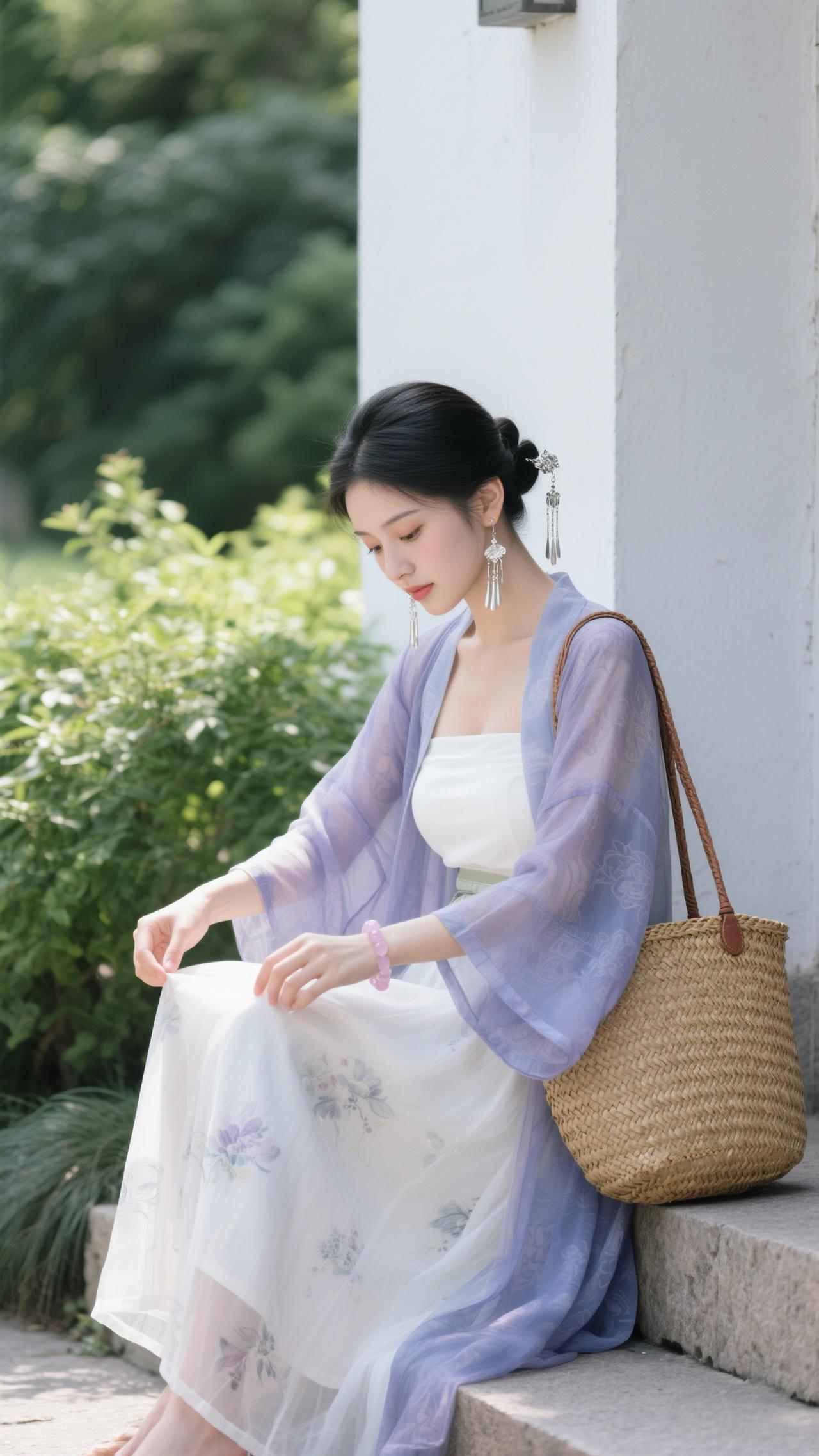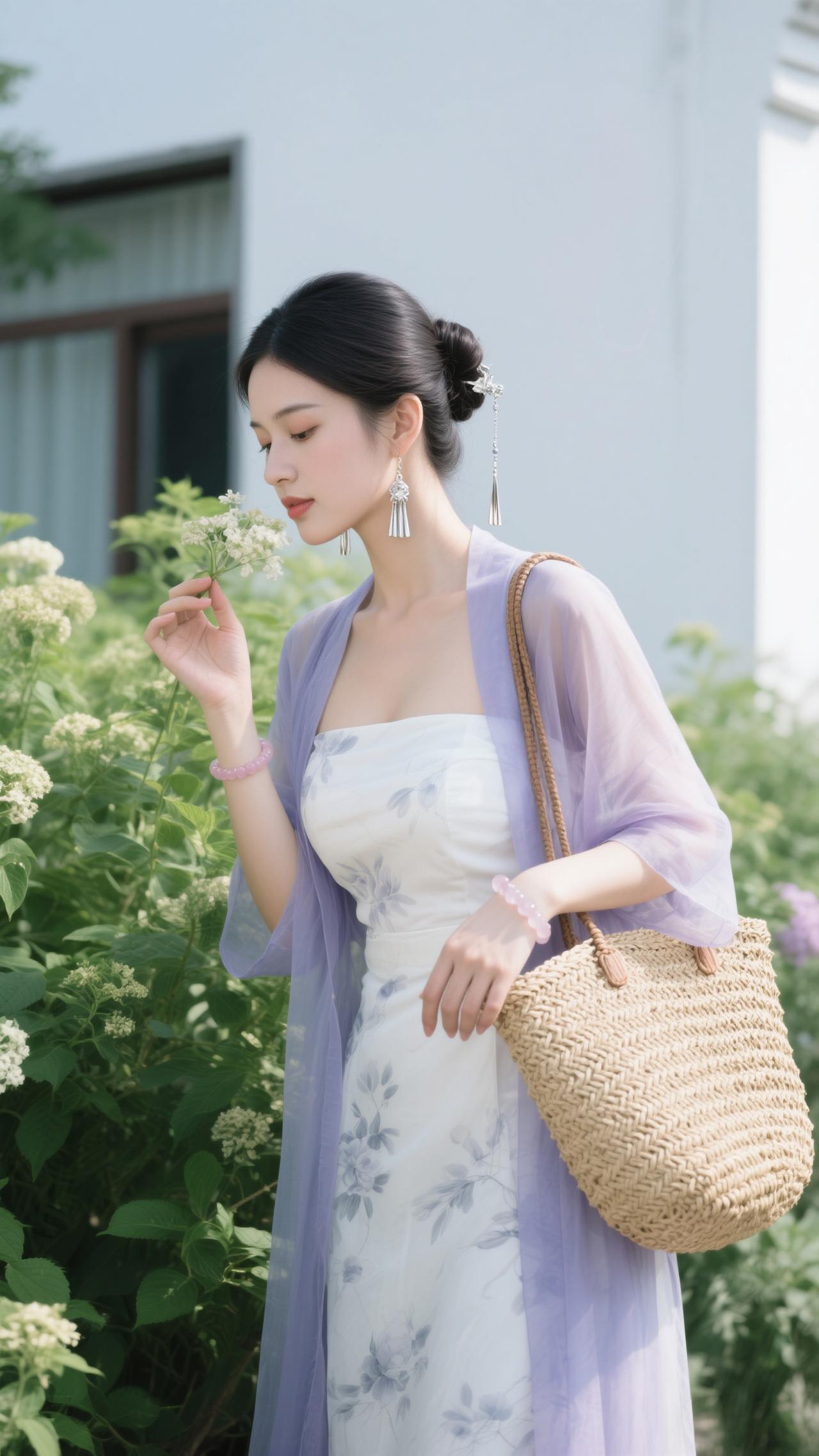 鹧鸪天·园畔雅行 罗袂生香立水湾,紫绡轻覆玉光绵。银簪暗锁玲珑韵,草篓明承逸趣甜。 心自畅,意偏闲,愿将幽绪寄云笺。一襟柔色随风漫,醉卧园隅梦也娴。