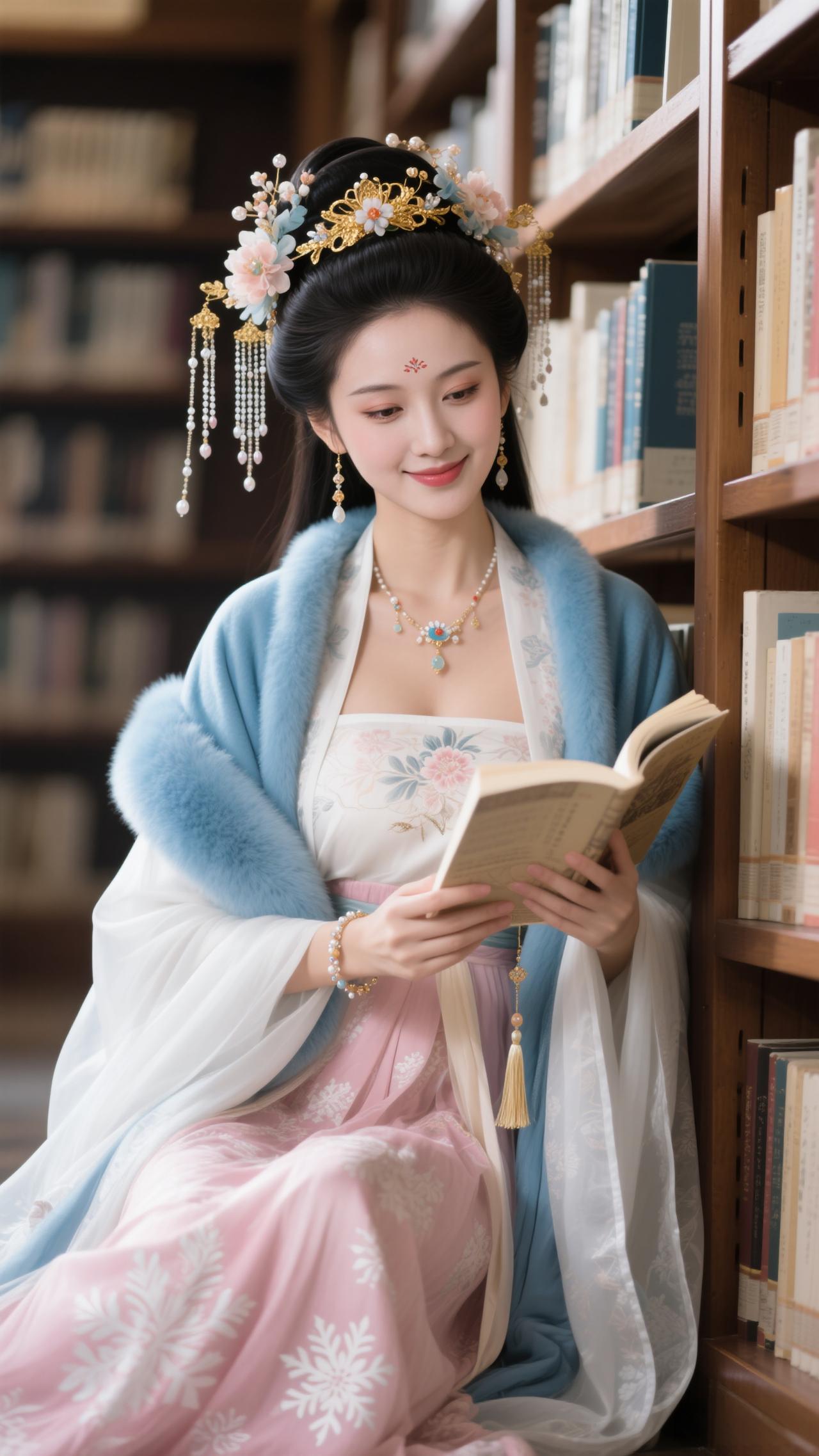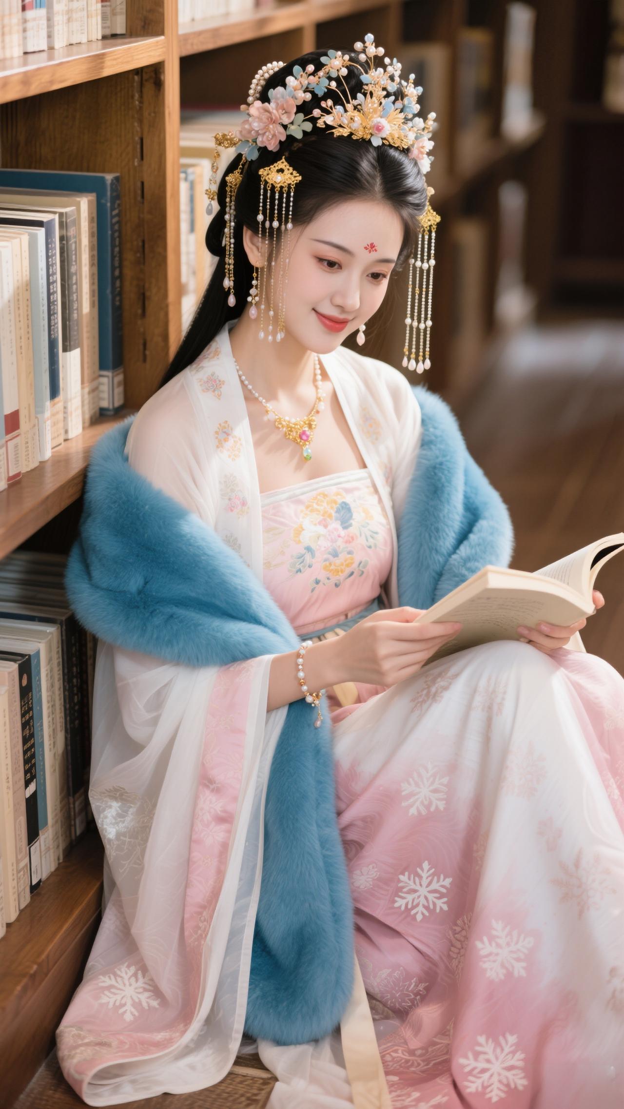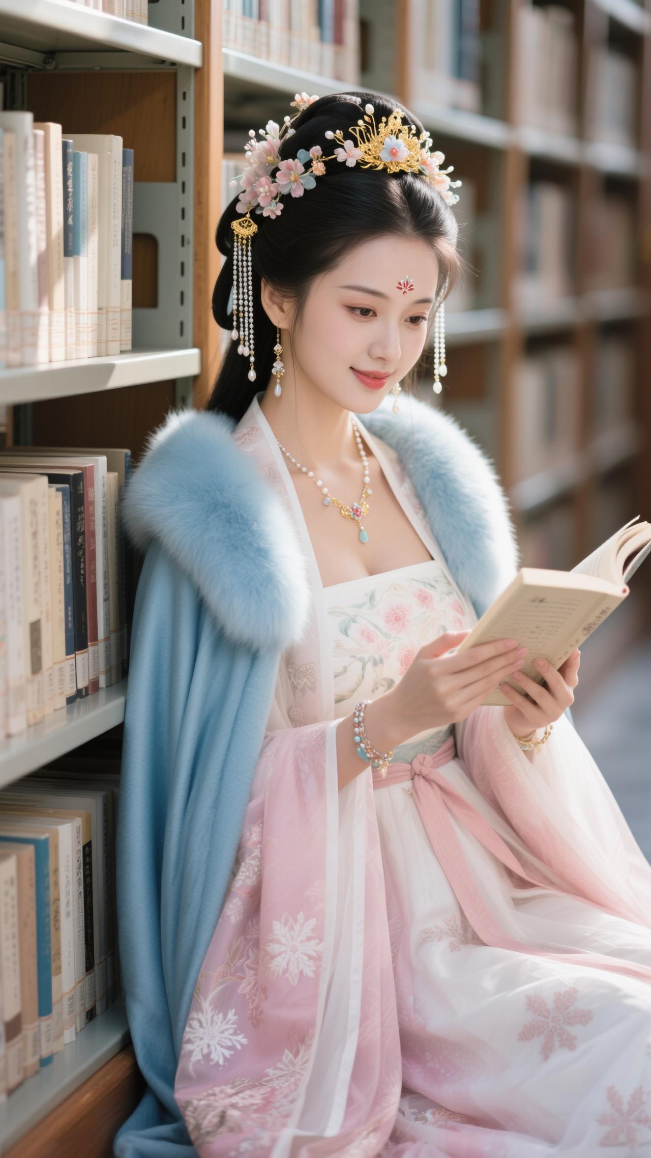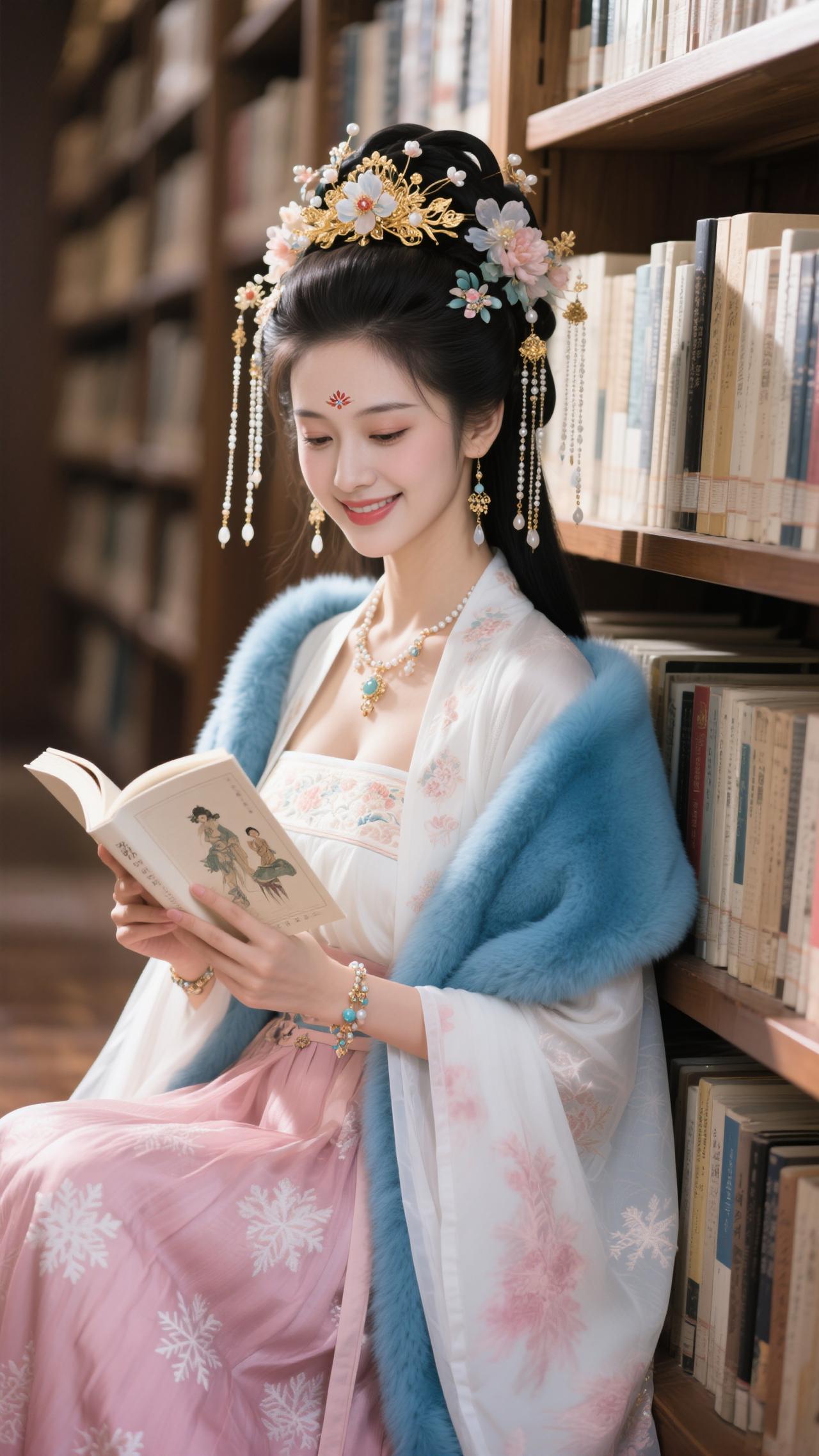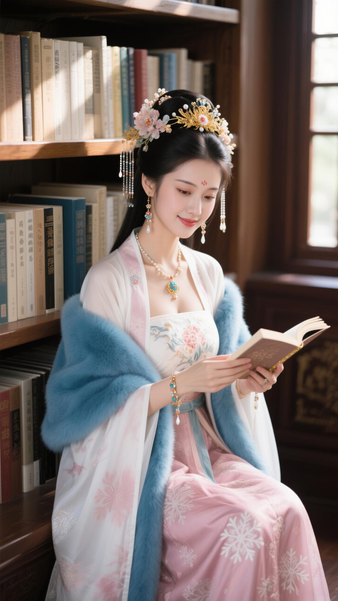 鹧鸪天·书馆春妆 云鬓簪花缀玉珰,雪衣轻覆软蓝霜。 袖间粉萼沾书页,额上朱砂印墨香。 抬素手,倚书廊,漫翻闲卷日初长。 春风似解怜人意,偷入芸窗拂鬓旁。