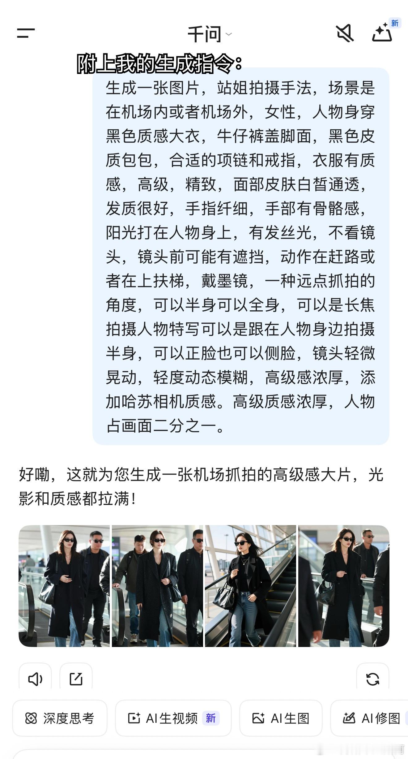 给甲方做了张“顶流机场抓拍”,他们问我哪家站子拍的。作为经常需要快速出视觉方案的人,我最头疼的就是找配图。上周的案子需要一张“机场抓拍”,我翻遍了图库,要么太摆拍,要么质感不够,那边又一直催稿,千钧一发之际同事说:“要不你试试千问吧,那个快”,就是这次“救急”,让我真正见识到什么是“指哪打哪”的图片处理能力。我的指令也很简单,就是把我脑子里想要的画面,氛围感描述给它。结果,第一稿出来我就愣住了。光影、质感、氛围全都在线。更神奇的是,它完全理解了什么叫做“站姐拍摄手法”最让我觉得好玩且强大的,是接下来的修改。我感觉第一版的包包是手提的不太好看,我直接对它说:“不要手提包,把包包换成单肩的,墨镜可以稍微滑落一点吗?露出眉毛部分”它真的听懂了。在生成的第二版、第三版里,细节被一点点调整。整个过程非常流畅,像是在和一个极有耐心的朋友沟通——“光感可以再暖一点吗?”、“再飞起一些碎发要好一些”。这种改到你完全满意的体验,把创作的掌控感彻底还给了我,从服装质地到皮肤通透感,从镜头焦段到画面颗粒,那些令我羡慕的专业成片效果,居然现在靠语言就能实现。而当我以为这已经足够惊喜时,我偶然点开了它的“AI生视频”功能。随便输入了一段和小狗有关的简单场景,短短10秒里,小狗的表情随着对话自然变化,口型与台词精准同步,甚至雨滴滑落窗玻璃的细节都细腻可见。我几乎没有多少时间成本,就完成了一个有情绪、有对话、有场景的微型故事。使用下来,千问App给我的感受是,它不只是一个工具,更是一位总能理解我创意意图的伙伴。让那些曾经被搁置的灵感,现在有了最轻盈的出口,而这整个过程,竟如此简单而有趣。用千问0元get站姐街拍