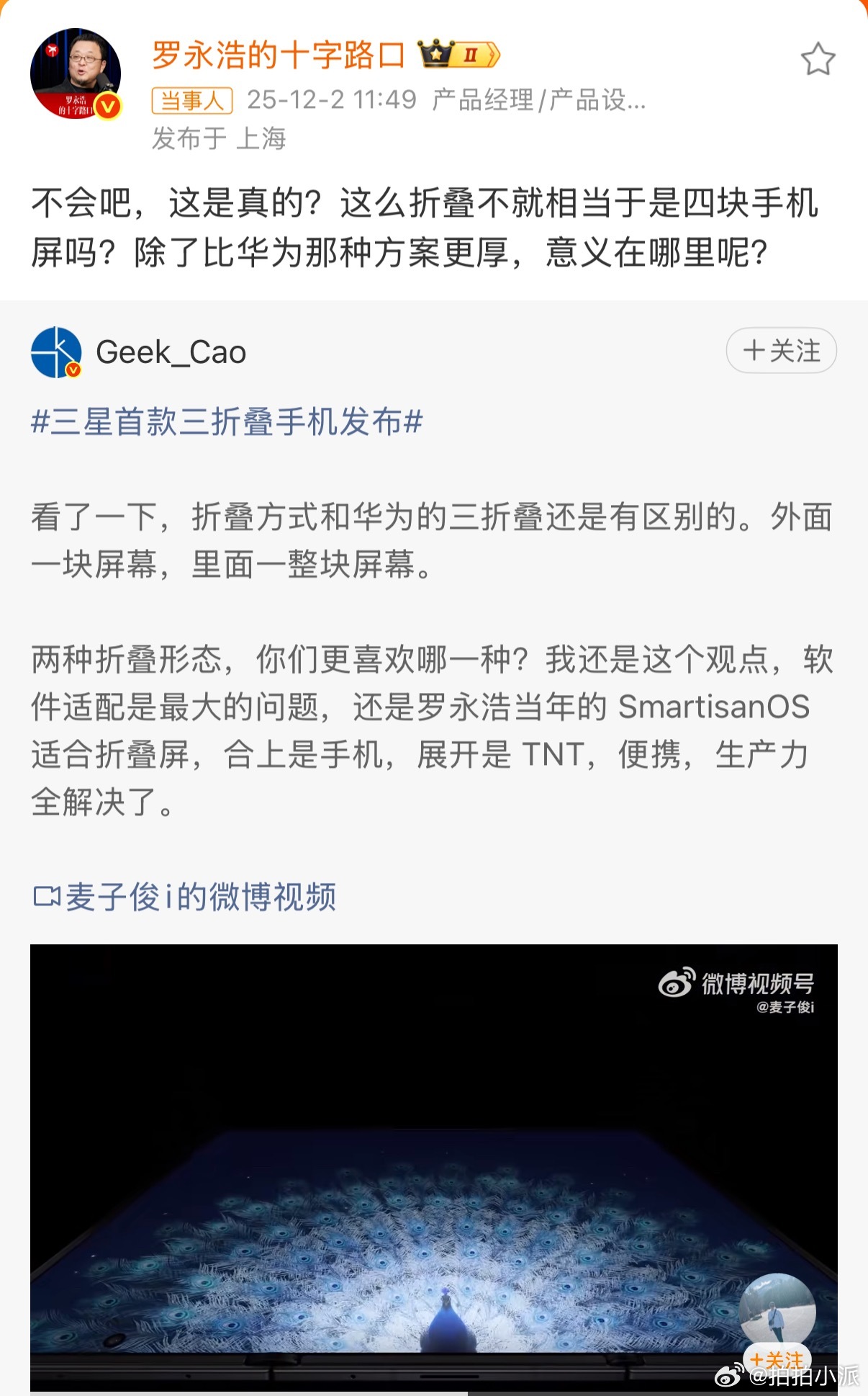 罗永浩谈三星三折叠罗老师说话还是一如既往的一针见血,但是我觉得餐饮界更需要你