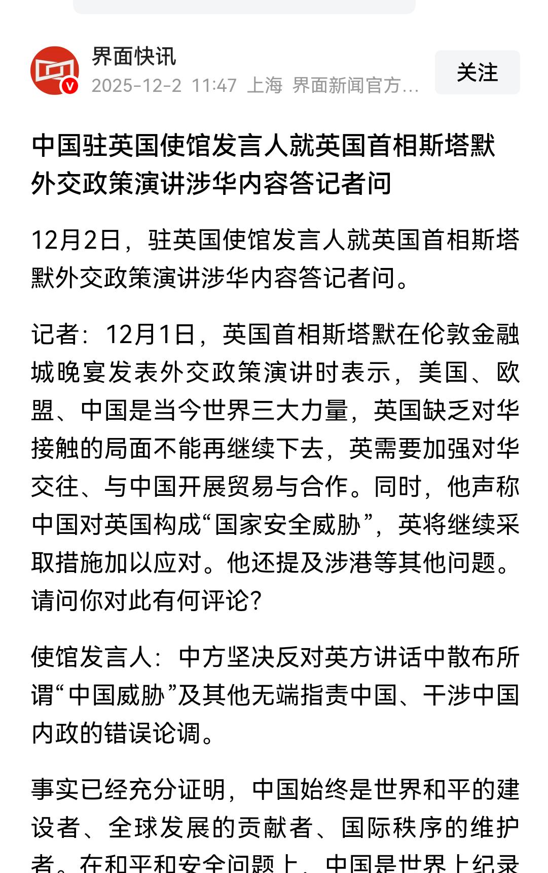“中国威胁论”? 这样奇葩言论竟然是英国首相说的![恐惧][恐惧][恐惧][恐惧] 怎么威胁了上万公里的英国呢? 英国首相斯塔默在伦敦市长晚宴上,称中国对英国构成”国家安全的威胁!” 同时又表示“但中国是巨大规模的国家,应该加强更深层的经济交流活动!" 就是这么的矛盾“既怕又要”! 不明白英国离中国十万八千里的,从哪里论的可以构成安全威胁了呢? 这一边说中国威胁,一边又想继续赚钱的心理,怎么那么别扭呢, 这是不是一边吃着,一边骂着呢! 对此,中国驻英国大使馆也作出了回应,驳斥了英国错误的言论,重申了中国对外的一贯立场和核心问题的原则! 大家又是怎么看待英国这一行为的呢? 斯塔默称中国是“国安威胁” 爆料 如何评价英国新任首相基尔斯塔默
