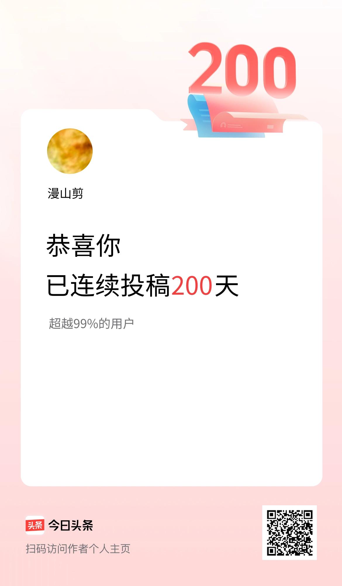 昨天向我报喜“你有50篇文章阅读量过万!”今天又来报喜了,说我在头条连续投稿200天。 200天,虽不多,但能坚持下来也算真的不容易。其间,老伴生病住院我去陪护了,大儿子开疝气、食道卡鱼卡住院我也去陪护了。家里收割油菜、收黄豆,以及栽培油菜再忙,我也没有停更过一天。 这份执着,都来自于我对头条有一种别样的爱! 友友们,你们在头条连续创作了多少天呢?其间若遇到小插曲,有没有坚持更新呢?又或者想过停更呢?