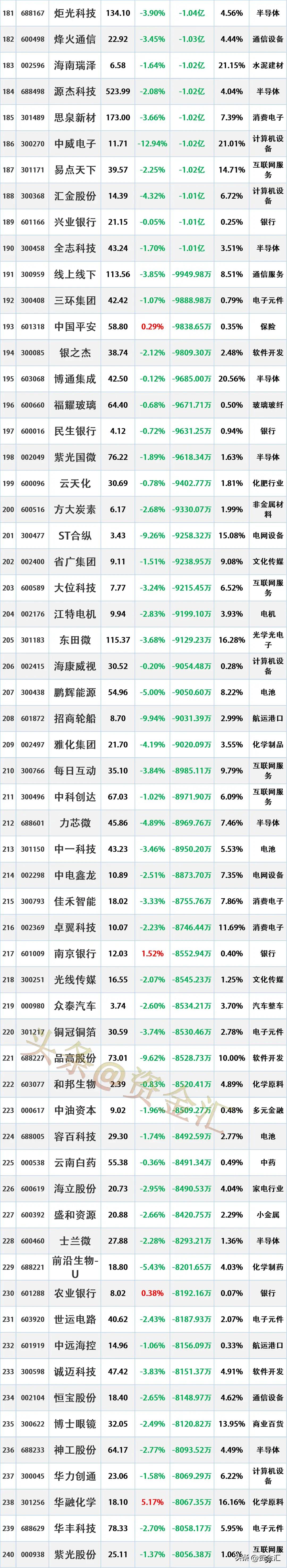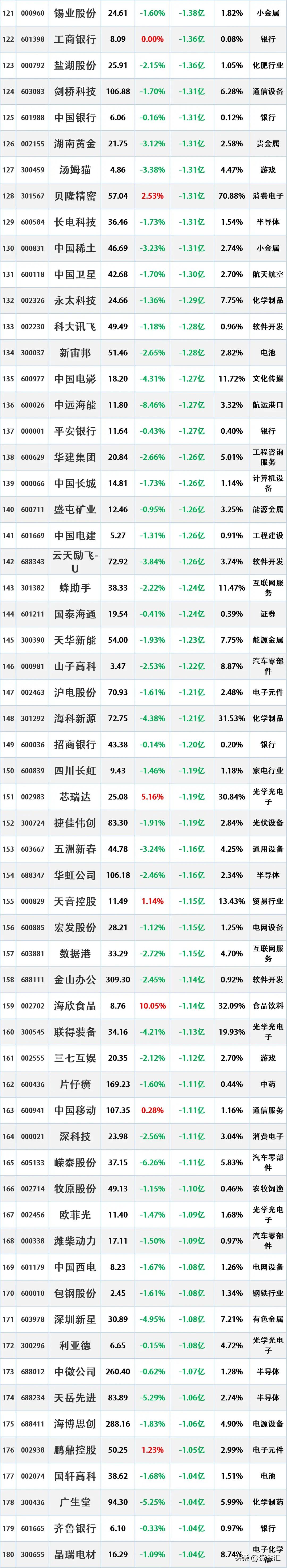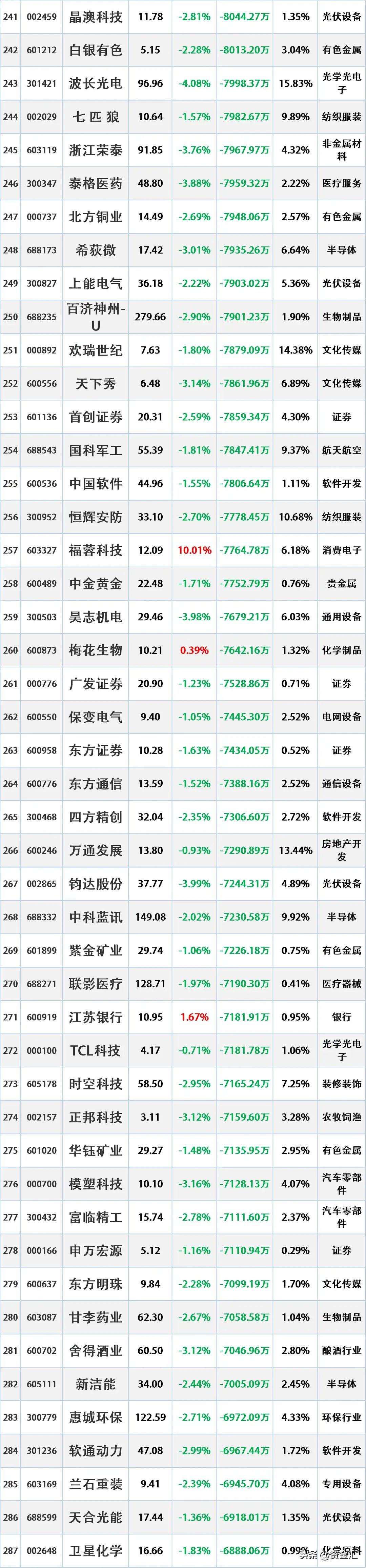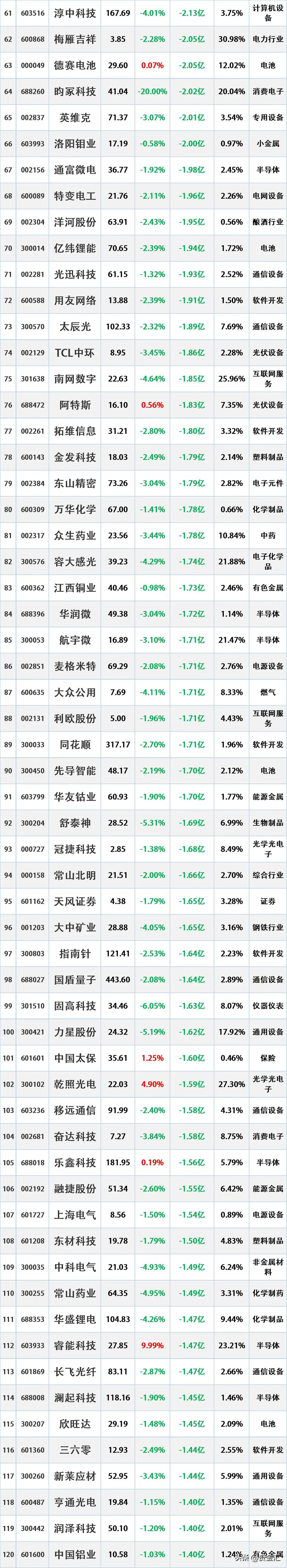 尾盘资金出逃,12月2日主力资金大幅流出的股票名单。 资金流出是指在一定时期内(如一天、一周等),主动卖出某只股票的资金量大于主动买入该股票的资金量。主动卖出是指投资者以买方的报价直接成交,显示出投资者对该股票的消极持有或抛售意愿。