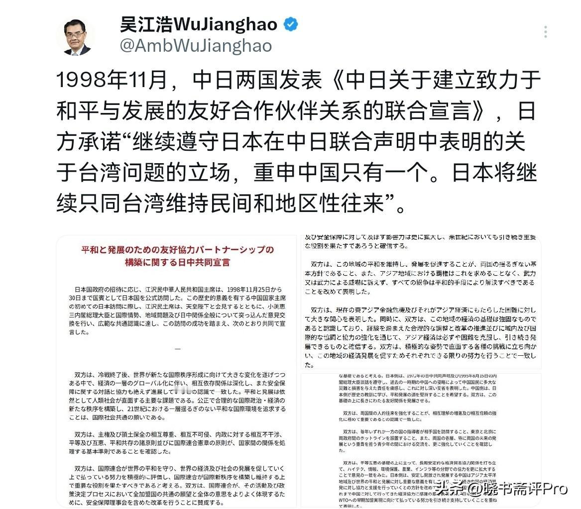 就看日本政府脸上挂不挂的住!高市早苗还扯什么旧金山和约,这一次我们拿出来了铁证,日本没有抵赖的余地!12月2日,我们的驻日大使吴江浩拿出来了日本外务省的声明原件。该联合声明写到,1998年11月,中日两国发表《中日关于建立致力于和平与发展的友好合作伙伴关系的联合宣言》。 日方承诺,继续遵守日本在中日联合声明中表明的关于台湾问题的立场,重申中国只有一个。日本将继续只同台湾维持民间和地区性往来。很显然,从这一份中日联合声明来看,日本明确承诺遵守一个中国原则,并认为跟台湾只能保持民间和地区性往来。 但是,现在高市早苗妄图引用旧金山和约,暗示所谓的台湾地位未定,这无疑证明高市早苗偏离日本一贯的立场已经非常远。日本含糊其辞的声称日本在台湾问题上持有一贯的立场,没有任何改变。那现在高市早苗怎么不出来再次重申一个中国原则,并表示日本跟台湾只能有地方及民间交流呢? 高市早苗的“台湾有事论”,这符合日本政府一贯的立场吗?很显然,完全不符合。我们这无疑是以铁证戳破了高市早苗政府的虚假做派,岂容高市早苗抵赖,蒙混过关。以现在中日实力对比,高市早苗主动挑衅,这无疑是自讨苦吃,我们当然会对其猛打,直到其完全改变立场。