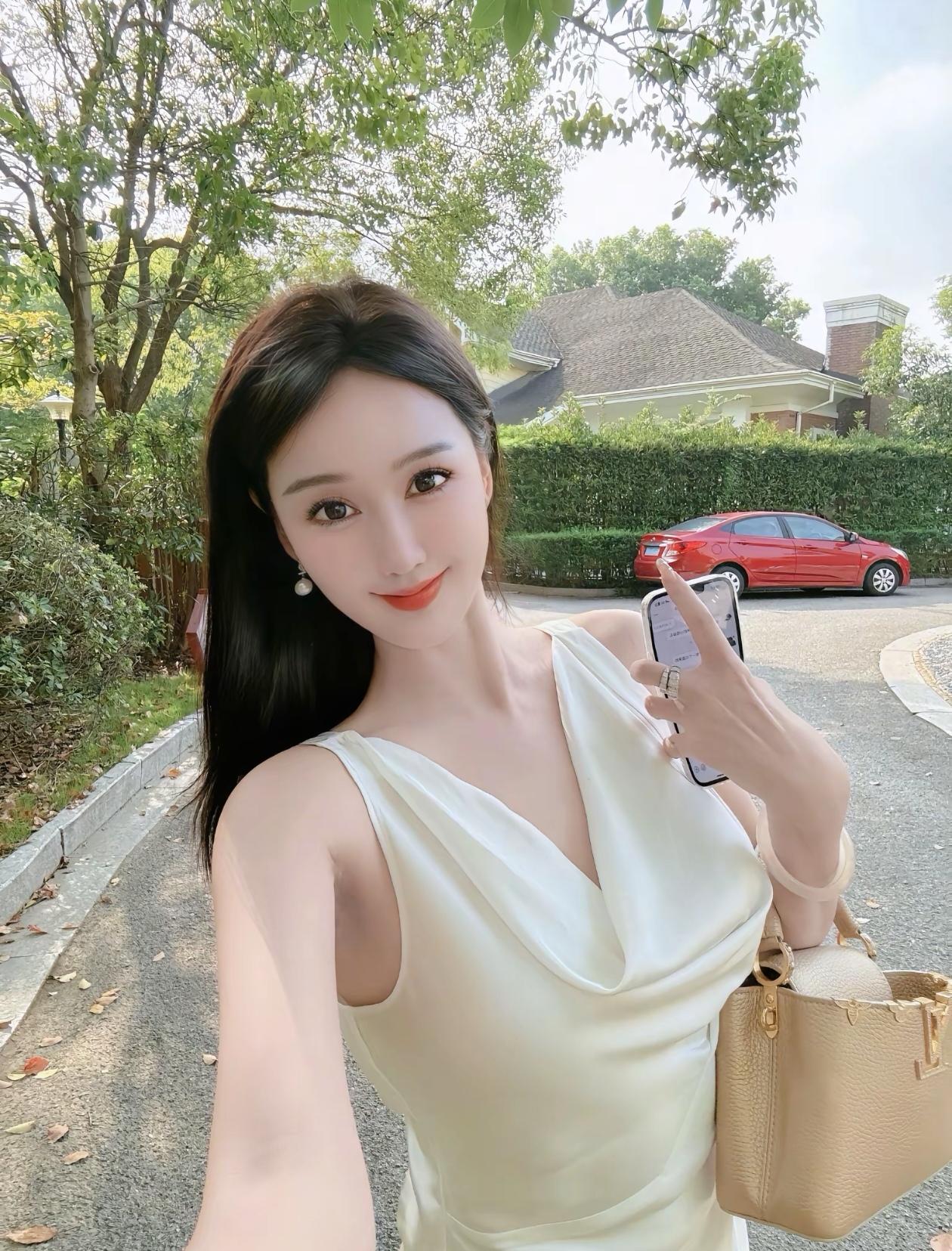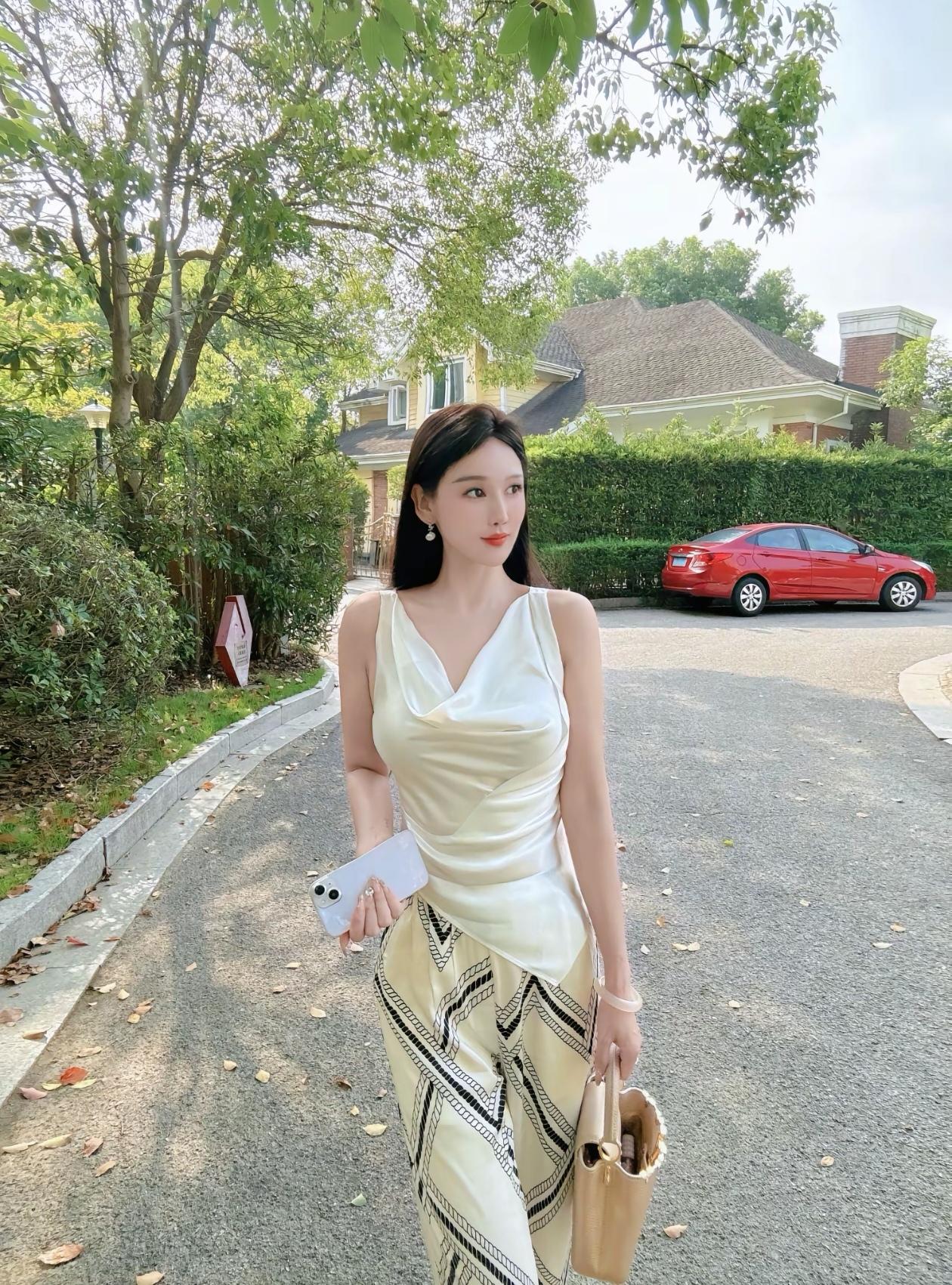 优雅夏日穿搭,白色连衣裙搭配米色手袋,轻松自在。