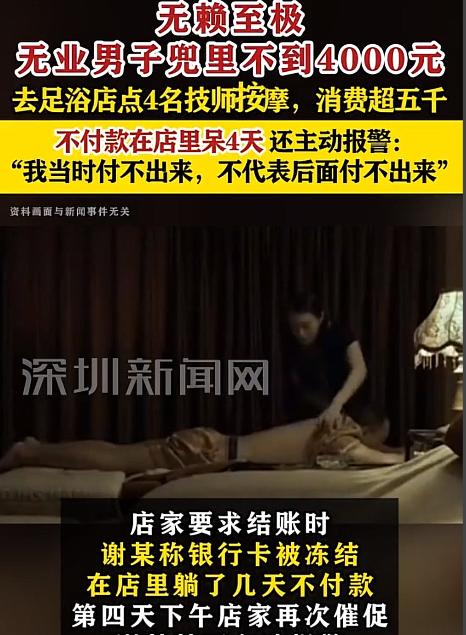 上海,男子在一家足疗店点了4名技师服务,并都加了钟,期间,还点了不少酒水。谁知,到付款时,男子却说银行卡被冻结了,付不了款。足疗馆不干了,不给钱,就别想走。就这样,男子在足疗店里躺了4天,却不联系家人来送钱,足疗馆见这样下去不是办法,再次催促男子付款,男子又提出赊帐。被拒后,双方起了争执,出乎意料的是男子先报了警,想让民警帮忙解决纠纷。结果,悲剧了。 谢某原本在老家跟着一支小包工队干零工,听说上海工地薪水高,于是跟几个酒友吹了几句“我要去上海发大财”。 可真正到了上海,他才发现一切并不是他想象的那样简单。 工地包工头那边确实愿意招人,但每天十几个小时的高强度活儿,日晒雨淋,手磨破皮、腰酸背疼,干了一天他就受不了。 第二天借口“肚子不舒服”没去,第三天连电话都懒得接了。 后来又去试着应聘外卖小哥,可要骑电瓶车、要熟悉路线、要接受风吹雨打,他又嫌麻烦;去做保安,要日夜轮班,他嫌困;去酒店当服务员,要面带笑容、动作利索,他嫌烦。 如此这般,他东挑西拣,晃荡了半个多月,不是“这不行”,就是“那不好”,唯一做得勤快的是每天在附近的便利店吹空调、刷手机。 钱也不是风吹来的。带来的千来块钱花得七七八八,看着钱包里所剩无几的几十块,他心里开始焦躁。回家?回去得被村里人笑话,说他“没出息”;找活?他又舍不得吃苦。 那天晚上,他路足浴店,门口招牌上写着各种“SPA”“技师一对一服务”等字样。 他突然想起之前在工地听过的吹牛话——有人说有些客人进这种地方,花钱如流水,一晚上几千不眨眼。他心里便琢磨:要是我进去潇洒一回,然后说没钱,是不是也能蒙混过去? 想着想着,他还真推门走了进去。 足浴店内暖黄色的灯光柔和,空气里弥漫着精油香气。迎宾小姐面带职业微笑:“先生,需要什么服务?” 谢某故作镇定,装作熟客模样:“来四个技师,全部加钟,再来点酒水。” 迎宾一愣,但看他口气阔绰,也没多问,客客气气地安排了。 接下来的几个小时里,他享受着按摩、足疗、推背,还叫了啤酒、果盘、夜宵,好不惬意。技师们还以为遇到了“大方的老板”,一个个态度更是热情。 直到结账时,店长报出数字:“先生,总共是六千六百八十元。” 谢某脸色一变,但很快摆出一副“我有钱但我不急”的姿态:“我银行卡被冻结了,暂时付不了钱。” 店长顿时皱起眉头:“那您要不联系家人朋友转账?” 谢某躺在沙发上,懒洋洋地说:“我爸妈都在乡下,没什么钱,我等工程款结了就还你们。” “那你先把证件压一下?” “身份证没有,弄丢了。” 店长心里已经察觉不对劲:“那对不起先生,账不结清,您不能离开。” 本以为谢某会紧张,没想到他直接“赖”在了店里。 于是,一场匪夷所思的“僵持战”开始了。 第一天,谢某睡醒后,店长再次催他:“先生,请尽快结账。” 谢某不紧不慢:“我是真没钱,要不你们再给我赊两天?” 店长当场气笑:“赊?我们这又不是银行!” 到了第四天,店长终于忍不了:“你到底什么时候给钱?” 谢某翻身坐起,皱眉:“你们天天逼我,烦不烦?我都说了没钱!报警吧,让警察来解决!” 店长瞪大眼:你赖账的人还报警? 可谢某真就拨了110,语气里还带着委屈:“警察同志,我被店家强制消费,还不让我走,你们快来。” 不一会儿,民警赶到。 民警直接在系统中查询相关记录。数秒后,民警眉头皱得更紧:“你今年四月开始,在另外三家足浴店也发生类似情况,是不是?” 谢某脸色瞬间煞白。 民警语气变得严肃:“你这是恶意逃避付费,多次实施相同行为,已经涉嫌寻衅滋事。现在跟我们走一趟吧。” 最终,法院依法判决谢某犯寻衅滋事罪,判处有期徒刑二年。