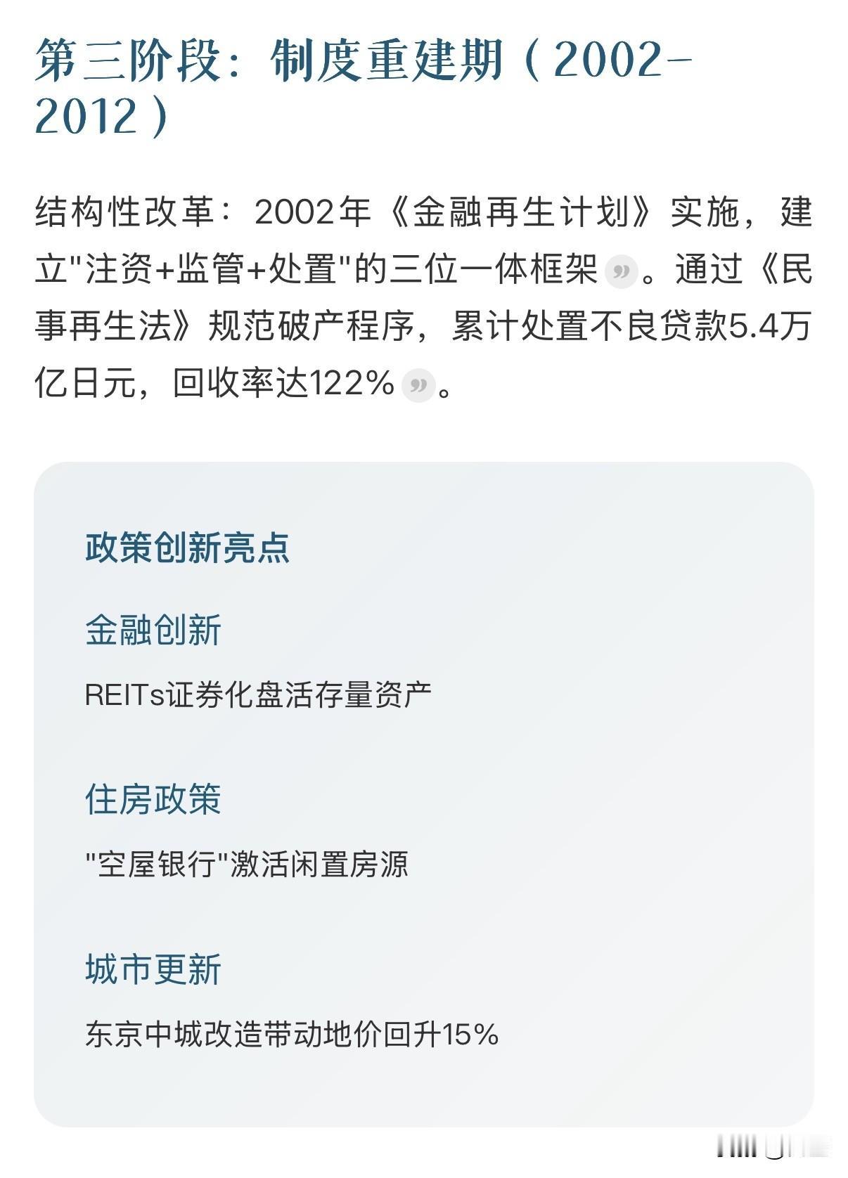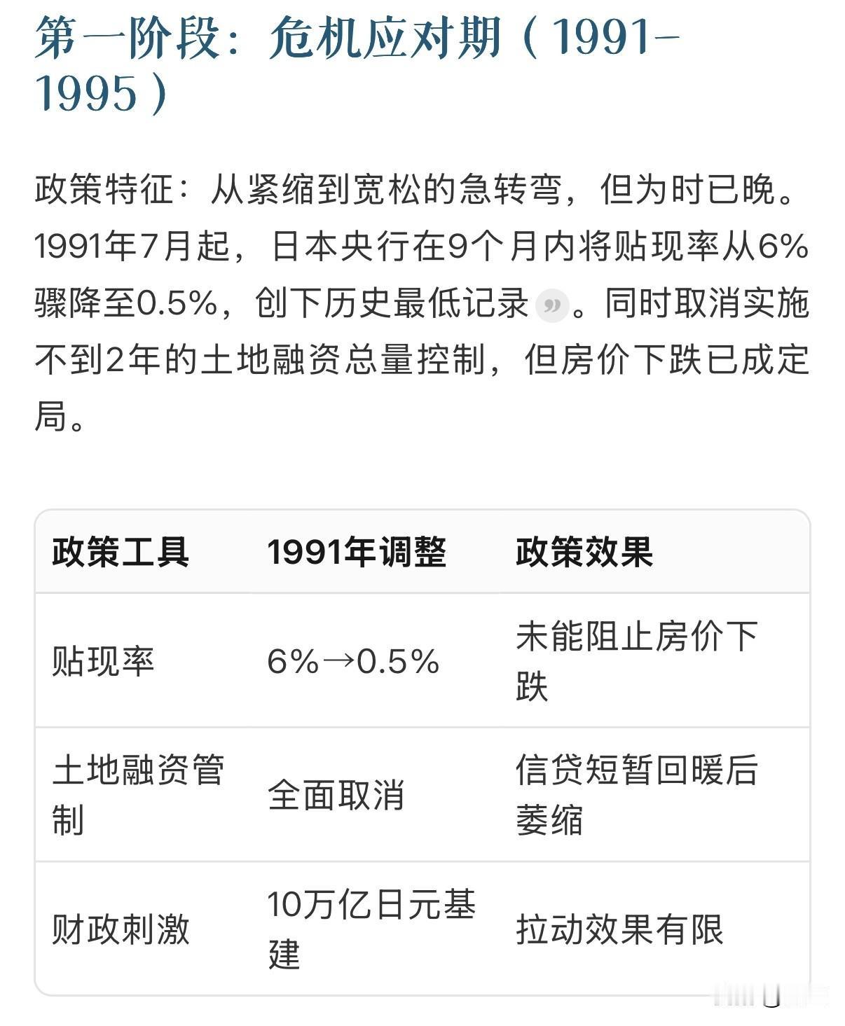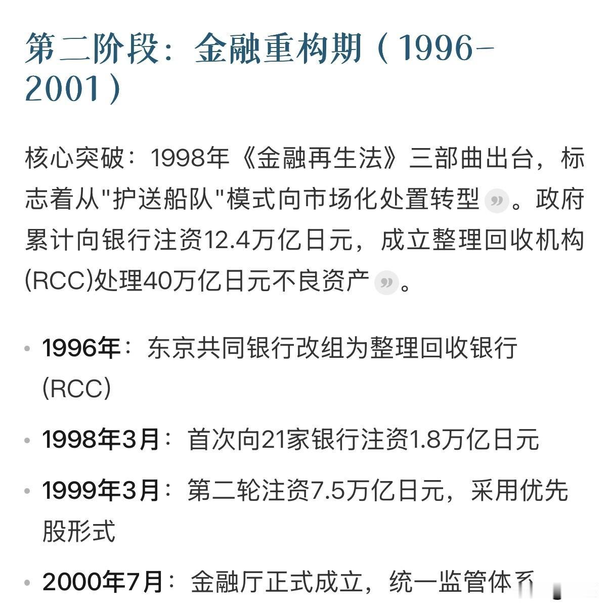房子都不要卖了,能劝一个是一个, 都说房地产像当年的日本, 但是,日本当年耗费了11年时间的政策,我们短短两年就打满了。 另外,看看现在的股市,当年股市低位买入的都赚的盆满钵满, 来看看日本当年政策, 日本当年政策演进三阶段, 从1991年泡沫破裂到2002年金融再生计划,日本政府经历了"政策转向→金融重构→制度重建"的完整周期,历时11年才完成系统性修复。 第一阶段:危机应对期(1991-1995), 政策特征:从紧缩到宽松的急转弯,但为时已晚。1991年7月起,日本央行在9个月内将贴现率从6%骤降至0.5%,创下历史最低记录。同时取消实施不到2年的土地融资总量控制,但房价下跌已成定局。 1),政策工具,贴现率 :6%→0.5%,未能阻止房价下跌; 2),政策工具,土地融资管制 :全面取消信贷短暂回暖后萎缩; 3),政策工具,财政刺激:10万亿日元基建拉动效果有限; 第二阶段:金融重构期(1996-2001), 核心突破:1998年《金融再生法》三部曲出台,标志着从"护送船队"模式向市场化处置转型。政府累计向银行注资12.4万亿日元,成立整理回收机构(RCC)处理40万亿日元不良资产。 1996年:东京共同银行改组为整理回收银行(RCC) 1998年3月:首次向21家银行注资1.8万亿日元 1999年3月:第二轮注资7.5万亿日元,采用优先股形式 2000年7月:金融厅正式成立,统一监管体系。 第三阶段:制度重建期(2002-2012), 结构性改革:2002年《金融再生计划》实施,建立"注资+监管+处置"的三位一体框架。通过《民事再生法》规范破产程序,累计处置不良贷款5.4万亿日元,回收率达122%。 其中政策创新亮点, 1,金融创新,REITs证券化盘活存量资产; 2,住房政策,"空屋银行"激活闲置房源; 3,城市更新,东京中城改造带动地价回升15%; 日本当年政策效果评估, 尽管政策力度空前,但日本房价直到2009年才触底,2012年后安倍经济学"三支箭"才推动实质性复苏。 关键教训在于:政策时滞过长——从泡沫破裂到制度重建完成,整整耗费了11年时间窗口; 房地产 全国房地产走势 房地产企稳了吗 房地产政策走向 中国房地产市场 房地产发展阶段