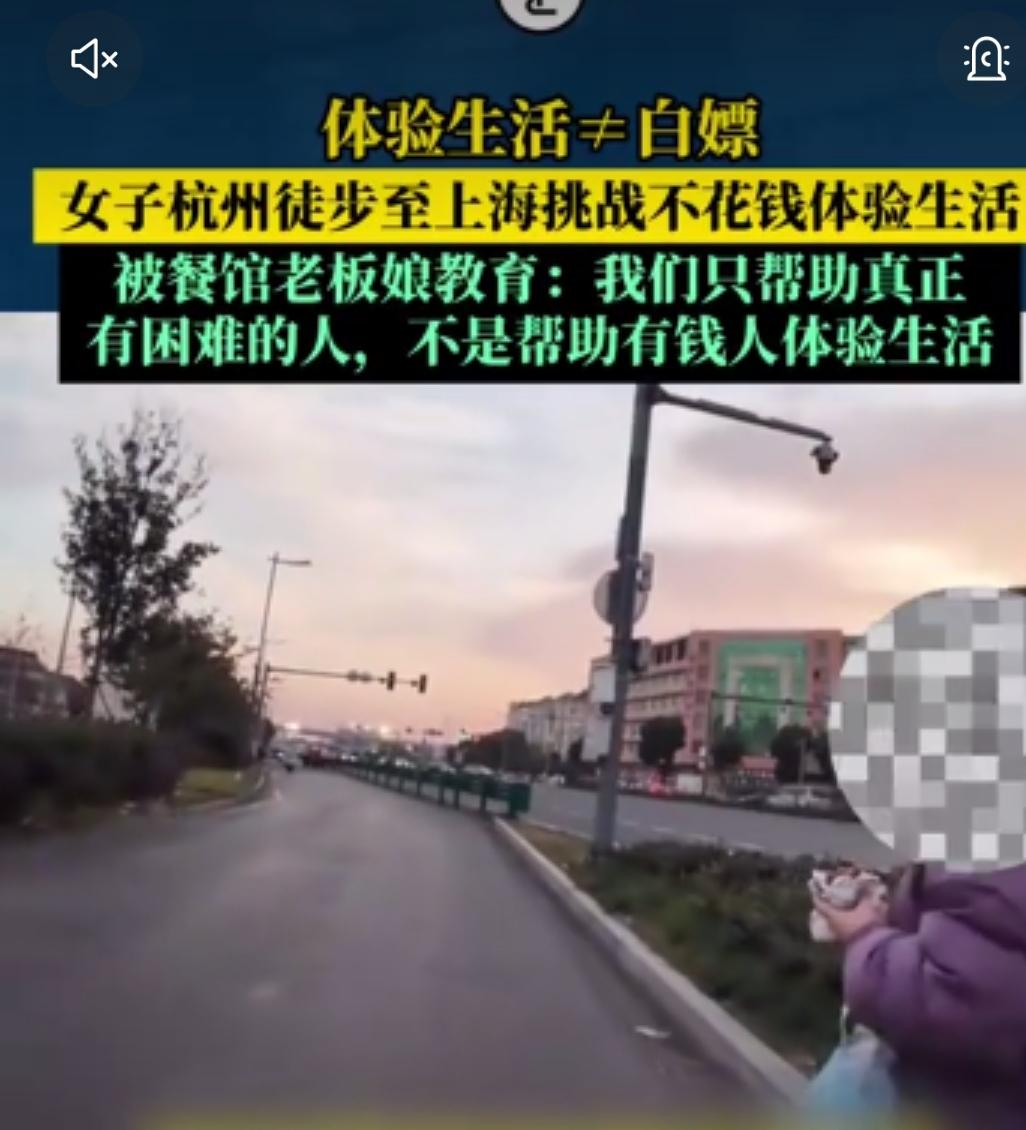 劲爆!杭州女子徒步上海“零元挑战”,餐馆蹭饭遭老板娘怒怼:不帮有钱人体验生活 11月25日,一则“女子徒步蹭饭被拒”的视频在网络疯传,引发全网热议。一名女子自称从杭州徒步前往上海,发起“不花一分钱”的旅程挑战,途中进店要求免费就餐,被老板娘当场硬核回怼,金句直击人心。 视频中,女子走进一家餐馆,向老板娘说明来意:“我正在徒步从杭州去上海,全程不花一分钱体验生活,能不能免费吃顿饭?”面对这一请求,老板娘毫不客气地拒绝道:“你们这些有钱人,还来体验生活,一顿饭钱都舍不得给?” 女子急忙辩解:“不是舍不得,是不让花,这就是一堂体验课。”老板娘却不买账,当场“教育”道:“我们开店做生意不容易,帮助的是真正有困难的人,不是帮你们有钱人体验生活,有困难的我们肯定帮,但这种情况不行。”一番话让女子无言以对,只能尴尬转身离开。 据悉,该女子此前已在街头向路人求助,同样遭到直接拒绝。此事曝光后,网友瞬间炸锅,几乎一边倒地支持老板娘:“怼得太对了!体验生活凭啥让别人买单?”“有手有脚不劳而获,这哪是体验生活,分明是白嫖!”还有网友吐槽:“真想挑战,大可打工换饭,张口就蹭纯属道德绑架。” 原本“穷游”“徒步”象征着磨砺意志的勇气,如今却被部分人扭曲成“转嫁成本”的借口。这些人将陌生人的善意当作“免费资源”,把“蹭吃蹭喝”包装成“体验生活”,实则透支着社会的善意信任。 老板娘的怒怼之所以让人解气,正因她戳破了本质:善意从来不是理所当然的索取,而是留给真正需要帮助的人。体验生活的真谛是自食其力的成长,而非投机取巧的索取。这场“零元挑战”终究成了一场反面教材,警示着每一个人:尊重他人劳动,才是对生活最基本的敬畏。女游客徒步