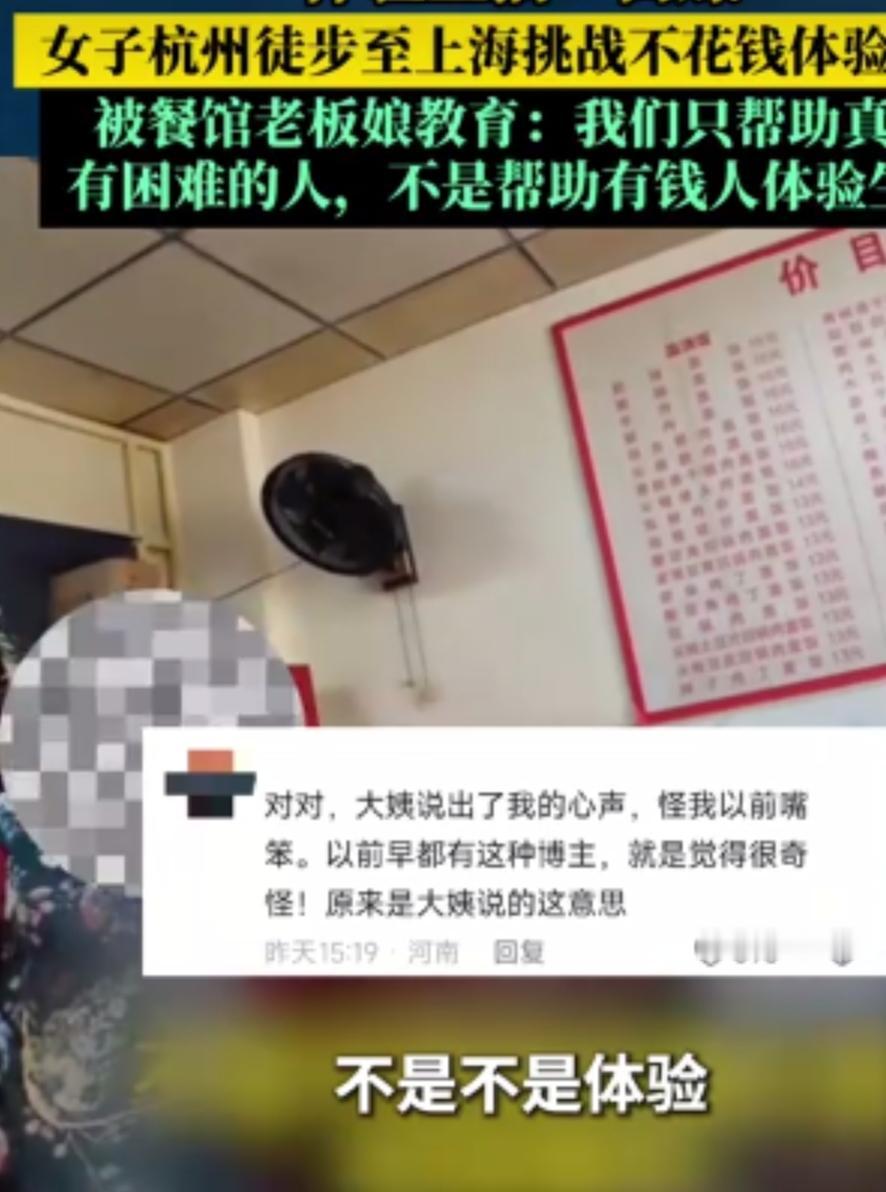 劲爆!杭州女子徒步上海“零元挑战”,餐馆蹭饭遭老板娘怒怼:不帮有钱人体验生活