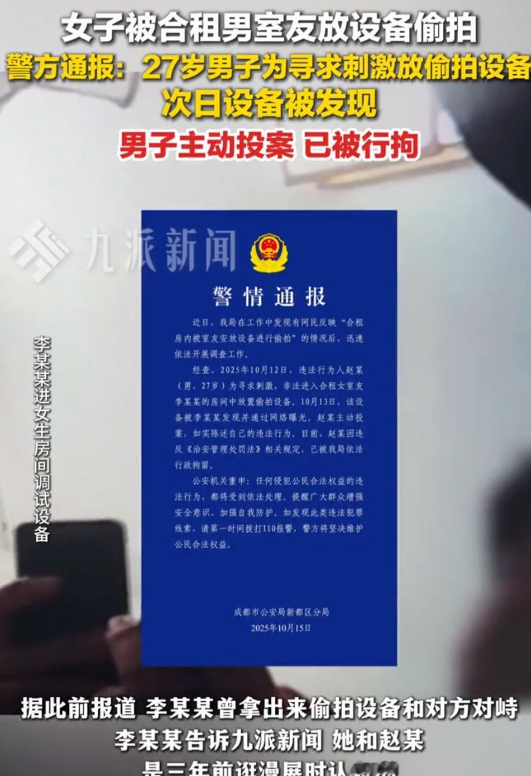 拘役6个月!合租男偷配钥匙藏摄像头,撕开都市合租的安全暗伤 一把暗藏的备用钥匙,一枚隐匿的微型摄像头,让合租单间沦为侵犯隐私的“重灾区”。近日,上海男子吴某长期偷窥女室友案宣判,其因非法侵入住宅罪获刑拘役六个月的结果,不仅敲响了合租安全的警钟,更明确了法律对“家”的绝对保护——即便只是合租房的单间,也不容非法侵犯。 事件中,吴某利用女室友藏于客厅的备用钥匙,多次潜入其卧室安装摄像头,后又将设备移至共用卫生间,持续偷窥长达一个月。直至女室友洗漱时发现设备,这场隐秘的侵犯才得以曝光。值得关注的是,本案的核心突破在于明确了合租单间的“住宅”属性:次卧与公共区域物理隔离、使用权排他,且承载日常起居功能,完全符合法律对“户”的界定,打破了“合租空间无绝对隐私”的错误认知。 透过个案看本质,此类事件频发暴露多重隐患:一方面,微型摄像头等设备易购易得,降低了侵权门槛;另一方面,租房平台普遍缺乏租客背景审查机制,前科人员可轻易混入合租群体。更值得警惕的是,78%的一线城市女性合租者明确要求“只限女生”,背后正是对安全感的迫切渴求,而现实中,从卧室偷拍、浴室闯入到隐私泄露,侵犯行为屡禁不止。 法律的判决绝非终点。吴某获刑的意义,在于以司法实践划定边界:合租不是隐私让步的理由,私密空间受法律绝对保护,非法侵入、偷拍等行为轻则面临行政拘留,重则构成刑事犯罪。对租客而言,需提高警惕做好防护;对平台来说,建立租客背景筛查、完善安防设施已是当务之急。 城市安居不该是奢侈品,合租空间更不应成为安全洼地。这起案件的判决,既是对受害者的正义回应,更是对所有租房者的法律宣告:无论居住形式如何,每个人的隐私与安宁,都有法律兜底守护。隐私摄像头
