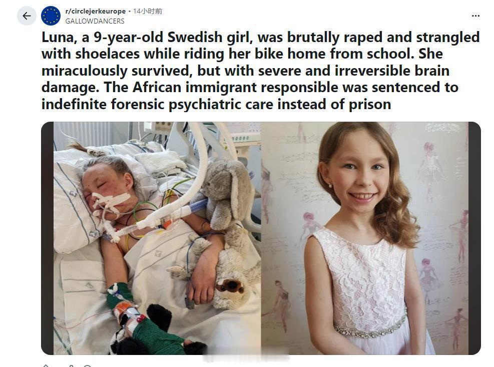 9岁的瑞典女孩,放学回家途中遭非洲移民残忍强奸后用电线勒脖子却奇迹般地生还,却遭受严重脑损伤,今后不能说话和走路最牛逼就是该国的白左政府,对这名非洲人报以了极大的“包容”和“耐心”,案发后,凶手不仅没有受审入狱,还为凶手提供了新住所,而且给于了长期的精神和心理治疗,最后凶手表示声称对这种"惩罚"很满意、很人道