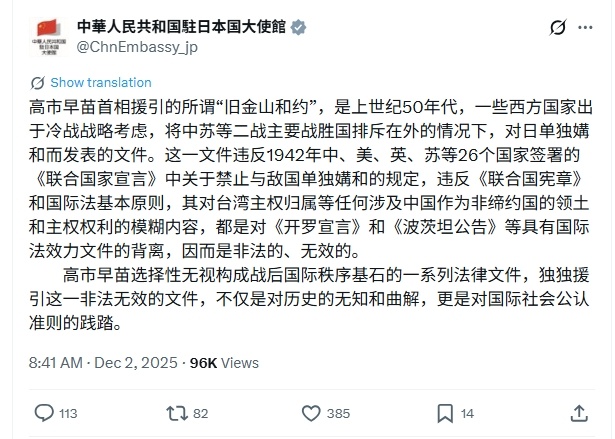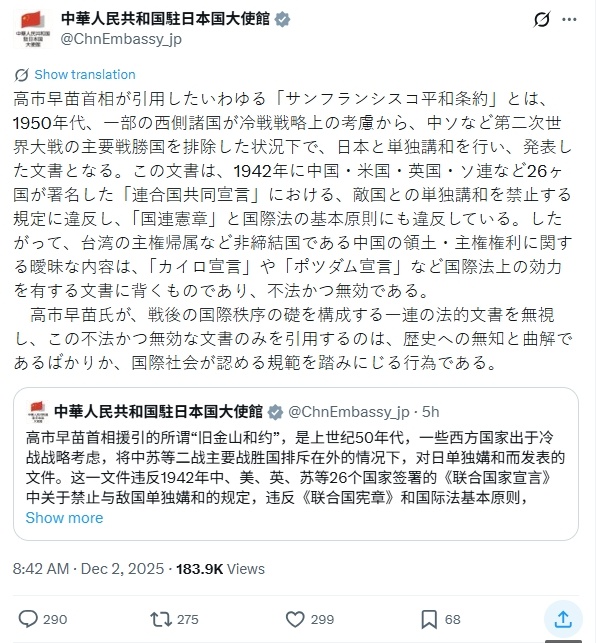 所谓的“旧金山合约”无效——中国驻日大使馆用中日双语发文强调,所谓的“旧金山合约”,将中苏排除在外,违反《联合国家宣言》中禁止与敌国单独媾和的规定,违反联合国宪章,背离《开罗宣言》和《波茨坦公告》,因此是非法的,无效的。热点观点中国驻日本大使发声