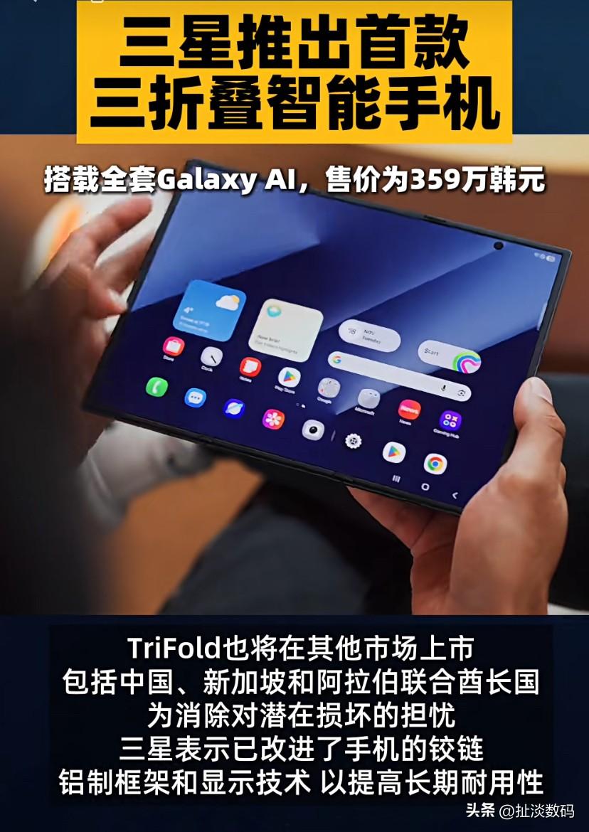 起售价:三百五十九万零四百韩元(3590400韩元),这一应该是在一个国家单个物品售价最高的手机了吧!我擦,一个手机以百万元的售价起售,真的把我这个月薪只有4位数的小收入人群给彻底吓到了,恕我无知,在韩国是不是每个人的工资都是几十万起步? 话不多说,直逼主题,继华为‌‌在2024年9月10日成功发布全球首款商用的三折叠屏手机HUAWEI Mate XT 非凡大师‌以后,时隔一年,就在今天全球智能手机出货量最多的手机制造厂商,三星也跟着推出了自家的第一款商用三折叠手机,名为:Galaxy Z TriFold,并且准备在本月12日正式在韩国上市,三星表示,将会在本月底之前在中国、新加坡和阿拉伯联合酋长国等国正式上市,还将计划在2026年第一季度的时候在美国发售该款手机。 另外根据三星官方公布的数据,该机采用的是双内折叠设计,这样的设计说是为了更好的保护主显示屏,这个设计也是跟华为三折叠手机最大的一个区别,其他方面,最大的特色就是,该机还搭载了三星的AI技术,最为智能化的就是用户在收起折叠屏的时候,如果折叠方向错了,就会有屏幕提示、震动提示、音效提示等多种提示来校正用户使用。 最后,为了更好的互动,给大家玩个游戏,你们谁能在5秒之内,认出图二是张人体哪三个器官么?