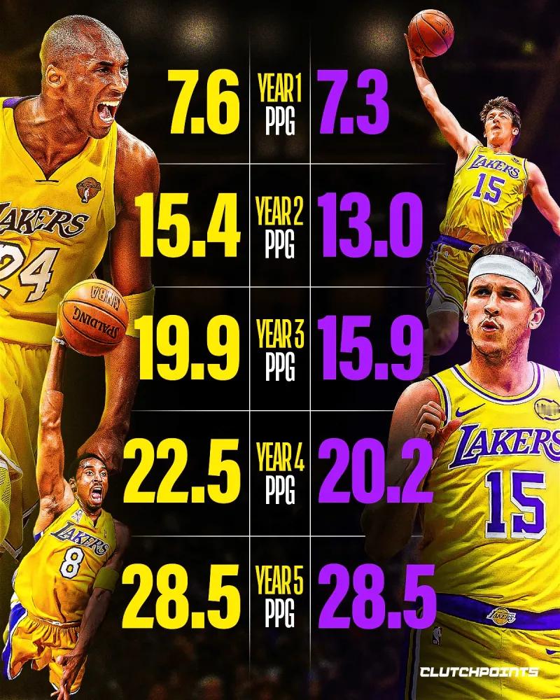 【美媒对比里夫斯和科比前五年数据:他注定成就伟大】今日,美媒ClutchPoints晒出了奥斯汀-里夫斯与科比-布莱恩特相似的前五年数据对比并配文:奥斯汀-里夫斯真正配得起 "乡村科比" 这个绰号: 🔸 成长速度惊人🔸 充满自信 🔸 得分能力飞跃 他在湖人每个赛季不断扩大的角色,正映照着一个清楚知道自己是谁、正在崛起的明星之路。 里夫斯持续进步,一场接一场,感觉他正朝着某种非凡的成就迈进。 他注定成就伟大。科比KobeBryant里夫斯