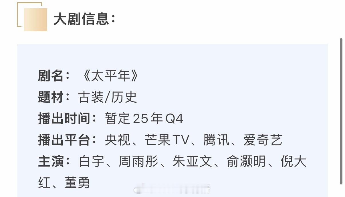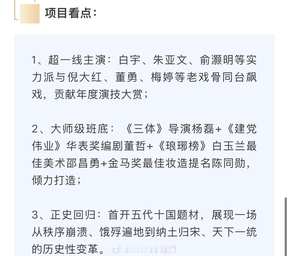 白宇、周雨彤、朱亚文《太平年》招商看点,25年12月央视+芒爱腾播出1、超一线主演:白宇、朱亚文、俞灏明等实力派与倪大红、董勇、梅婷等老戏骨同台飙戏,贡献年度演技大赏;2、大师级班底:《三体》导演杨磊+《建党伟业》华表奖编剧董哲+《琅琊榜》白玉兰最佳美术邵昌勇+金马奖最佳妆造提名陈同勋,倾力打造;3、正史回归:首开五代十国题材,展现一场从秩序崩溃、饿殍遍地到纳土归宋、天下一统的历史性变革。