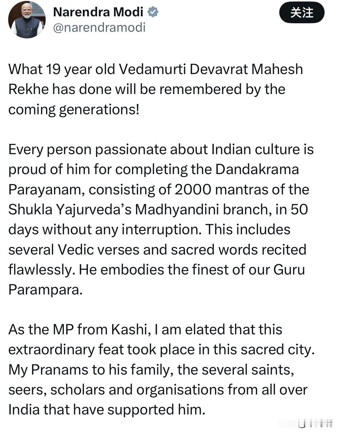 Devavrat Mahesh Rekhe(德瓦夫拉特·马赫什·雷赫),一位来自印度阿希尔亚纳加尔(Ahilyanagar,原艾哈迈德纳加尔)的19岁吠陀学者。 德瓦夫拉特在印度瓦拉纳西(Kashi)完成了《 शुक्ल黑夜柔吠陀(Shukla Yajurveda)》的“ दंडक्रम(Dandakrama Parayanam)”背诵。 这一极具挑战性的壮举在近 200 年的历史上只出现过几次。 他在 50 天内连续、无误地背诵了包含 2,000 多条曼特罗(mantras)和吠陀经文。 他的成就受到了广泛赞扬,包括印度总理纳伦德拉·莫迪(Narendra Modi)在内的许多人都对他表示了祝贺。