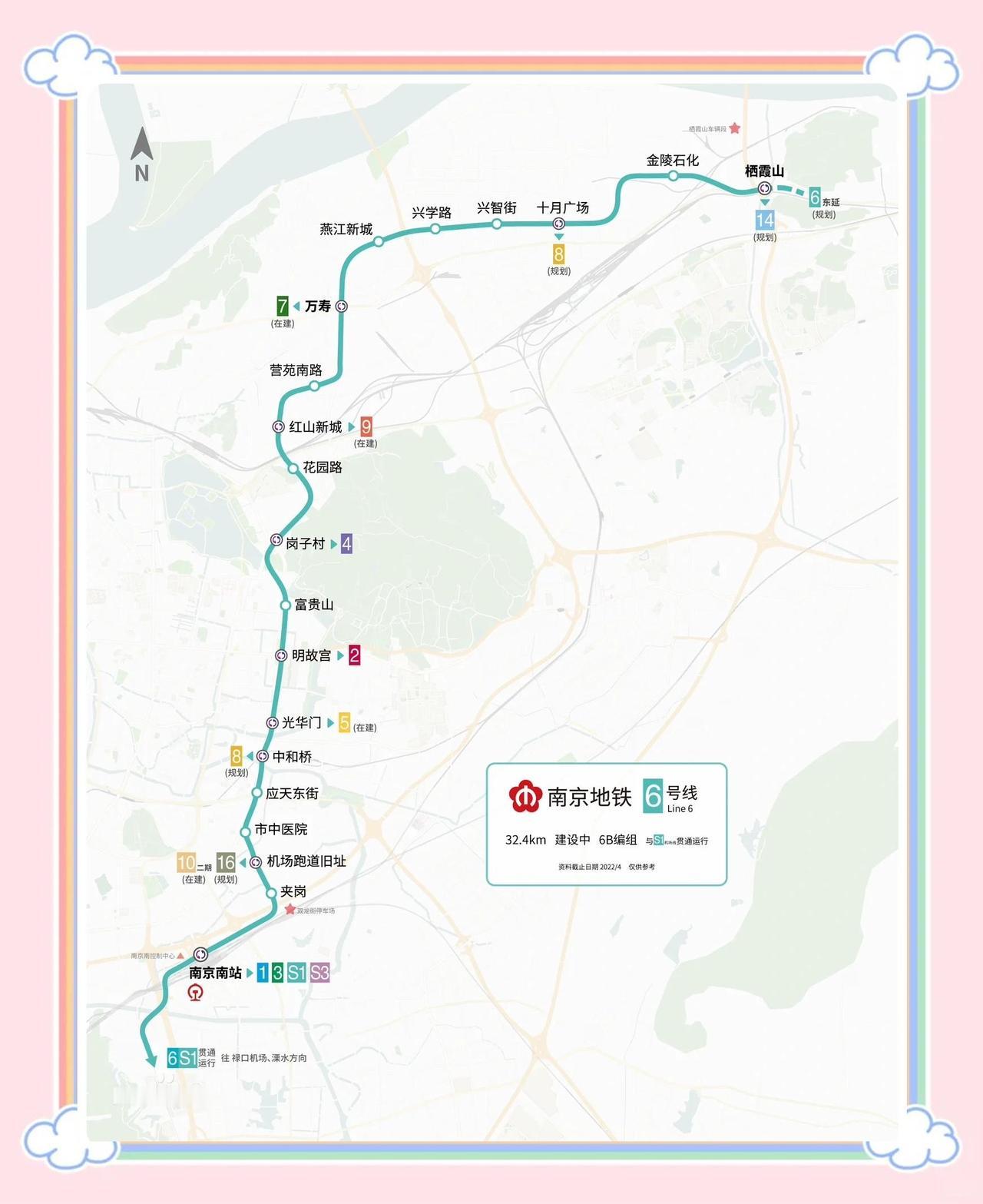 南京地铁6号线 南京地铁6号线的进展太让人期待了!南京地铁6号线是中国江苏省南京市境内一条在建地铁线路,标志色为青绿色(色号:00B2A9),于2019年12月28日正式开工,计划2025年开通运营。 线路全长32.365千米,全部为地下线,设19座地下车站,北起栖霞山站,南至南京南站,途经栖霞、玄武、秦淮、雨花台和江宁五区,贯穿新港开发区、紫金山、中心城区及南部新城,未来将与地铁S1号线贯通运营。采用6节编组B型鼓形列车,最高运行时速100千米/小时,日均客运量初期预计达59.3万人次。 想象一下,以后坐着6号线,能快速穿梭在南京各个区域,节省不少时间。像上班族能多睡会儿懒觉,游客也能更便捷地打卡景点。我已经在心里规划好等它开通后,要坐着它去探索南京的更多角落,感受这座城市不一样的魅力。南京地铁 南京地铁进站 南京地铁站名 六号线地铁盘 地铁南京路站