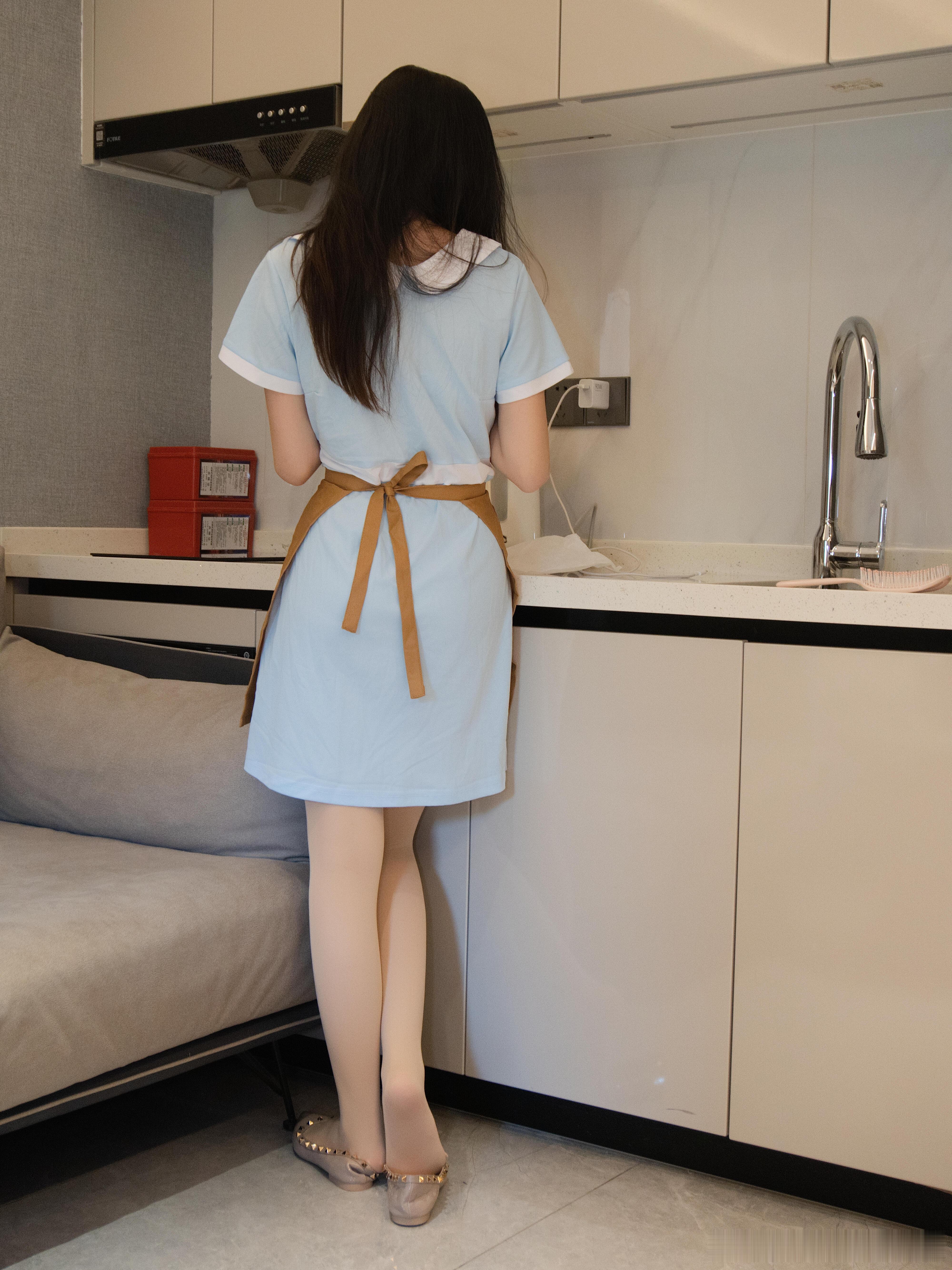 浅蓝小裙配焦糖色围裙,和室内的浅色调好搭,好像下一秒就要去打包半熟芝士了~
