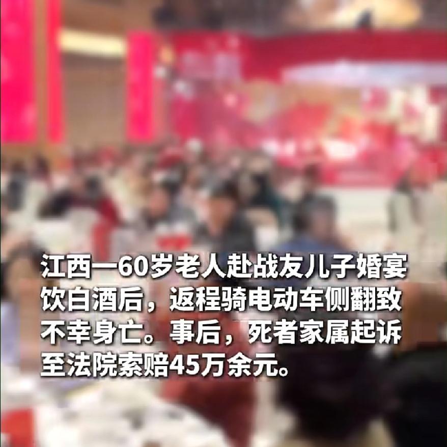 想钱想疯了 战友一场好心办酒, 咋就成了被告?江西宜春这事儿真让人寒心!真的是好心办坏事儿吗? 60岁战友受邀参加婚礼,自斟自饮2两白酒,散席后骑电动车不小心侧翻身亡,家属转头就把宴请方和同饮者告了,张口要45万。 好在法院两审都驳回了诉求,这判决真的大快人心!关键人家没劝酒、没灌酒,酒精含量也没到醉驾标准,你凭啥告人家? 关键事后家属还拒绝尸检查死因,到底里边有什么猫腻,就不好说了。 成年人该为自己的选择负责,宴席不是免责金牌,情谊往来不该被利益绑架,不然以后谁还敢真心待人? 你觉得这种情况下宴请方该担责吗?如果是你遇到这种事会怎么处理?江西婚礼闹剧 余干上门办酒 江西上门宴 酒驾