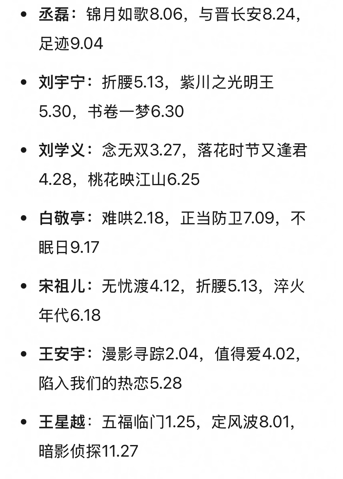 今年居然这么多人播了三部剧,有一部能舞出来水花就够了,现在播剧能火太不容易了。任嘉伦:无忧渡4.12,凤凰台上11.14,风与潮定档12.08成毅:赴山海9.11,天地剑心10.25,长安二十四计定档12.12宋威龙:相思令1.20,韶华若锦5.19,七根心简6.08白鹿:白月梵星1.7,北上3.3,临江仙6.6王影璐:异人之下决战碧游村,1.18,献鱼8.16,十二封信8.29,宴遇永安10.09卢昱晓:五福临门1.25,榜上佳婿4.25,入青云10.08丞磊:锦月如歌8.06,与晋长安8.24,足迹9.04刘宇宁:折腰5.13,紫川之光明王5.30,书卷一梦6.30刘学义:念无双3.27,落花时节又逢君4.28,桃花映江山6.25白敬亭:难哄2.18,正当防卫7.09,不眠日9.17宋祖儿:无忧渡4.12,折腰5.13,淬火年代6.18王安宇:漫影寻踪2.04,值得爱4.02,陷入我们的热恋5.28王星越:五福临门1.25,定风波8.01,暗影侦探11.27