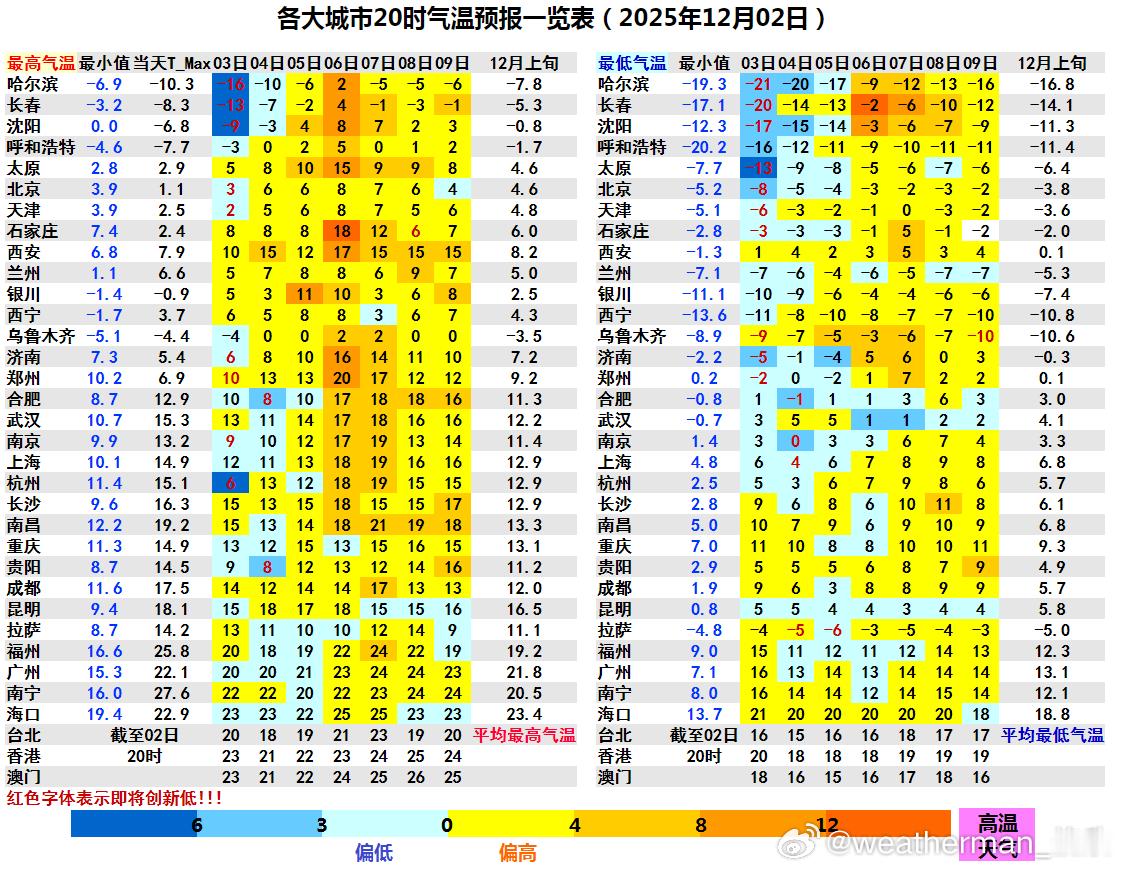 【冷】今天东北华北多地经历入冬后最冷的一天,长春、沈阳、呼和浩特、北京、天津、石家庄,今天无论最低气温还是最高气温,都是入冬以来最低。明天早晨,会更冷。哈尔滨和长春可能跌破零下20℃,太原可能跌破零下10℃,郑州可能跌破0℃,都是将是下半年首次。北京明晨最低预计为零下8℃。此外明天南方多地的气温还会继续下降。江南部分地区白天的气温可能降至10℃上下(今晚杭州预报数据有些问题,从数值预报看,明天最高应该是10-11℃)。不过明天白天,内蒙古多地气温就会开始回升,后天东北华北多地气温将大幅上升,12月5-6日,我国大部地区的气温又会转为明显偏高。7-8日虽然还有弱冷空气东移南下,但只是修正一下过于偏高的气温。目前从大趋势看,再来比较强的冷空气,估计要12月10日以后。图9为欧洲数值预报,10日冷高压已经开始影响新疆,11-12日继续东移南下,波及到我国大部地区。但因为时效尚远,模式之间差异较大,后期继续关注形势的演变。