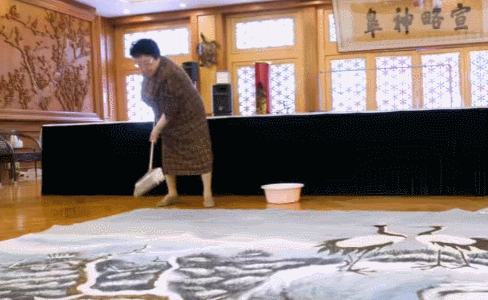 感叹祖国幅员辽阔的同时,也被陈丽华的绘画技巧所“惊艳”:她居然把宣纸铺在地上,手拿一个扫把,蘸上墨水,大刀阔斧的开始作画——其动作之潇洒,技巧之大胆,堪称一绝!