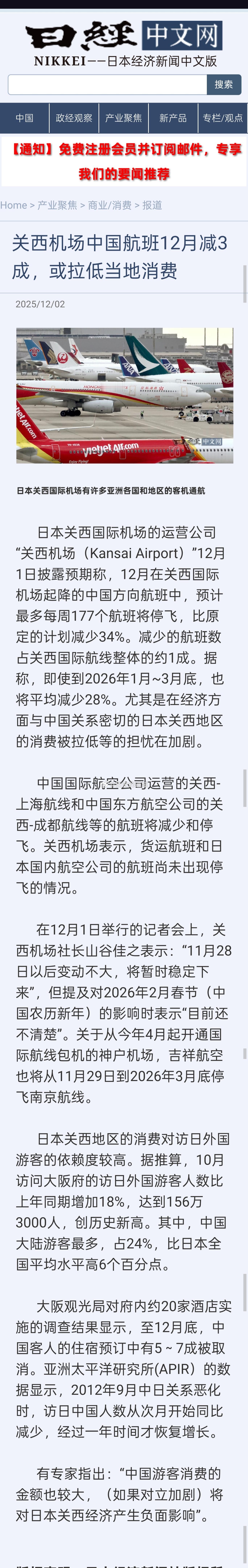 日本关西国际机场的运营公司“关西机场”12月1日披露预期称,12月在关西国际机场起降的中国方向航班中,预计最多每周177个航班将停飞,比原定的计划减少34%。减少的航班数占关西国际航线整体的约1成。据称,即使到2026年1月~3月底,也将平均减少28%。尤其是在经济方面与中国关系密切的日本关西地区的消费被拉低等的担忧在加剧。