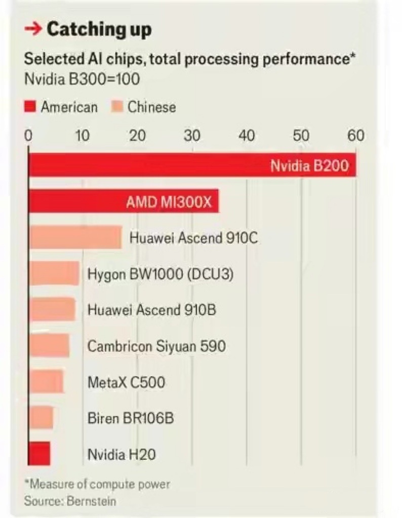 经济学人:中国芯片产业的进展似乎显示美国的制裁正在失效。文章说,虽然中国企业目前没有EUV光刻机,但是咨询公司SemiAnalysis预测,即便良率仅为台积电的一半,中国晶圆厂也将能制造出数百万颗AI芯片,足以满足国内大部分需求。他们说,中国企业可能永远无法在能效或性能上追上全球领先者。但到2026年底,或许已能满足大部分自身需求。实际上,因为AI芯片有生命周期,就是当芯片的算力收到的市场服务费用不足支付运营和电费时候,这些AI芯片就属于入不敷出,要淘汰。所以只要在生命周期里面,中国芯片的电费加起来比买英伟达芯片的差价还少,商业逻辑就闭环了,实际上也是如此。所以下来英伟达需求在中国会被边缘化。