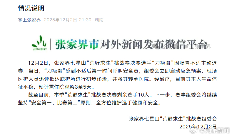 #刀疤哥预计需住院观察3至5天#【#组委会通报刀疤哥情况#】张家界七星山“荒野求生”挑战赛组委会12月2日发布:12月2日,张家界七星山“荒野求生”挑战赛决赛选手“刀疤哥”因肠胃不适主动退赛。当日,“刀疤哥”感到不适后第一时间呼叫安全员,组委会立即启动应急预案,现场医护人员迅速抵达庇护所进行初步诊治,并将其转至医院。经治疗,目前其本人生命体征平稳,预计需住院观察3至5天。截至目前,本季“荒野求生”挑战赛决赛剩余选手10人。下一步,赛事组委会将继续坚持“安全第一、比赛第二”原则,全方位维护选手健康和安全。