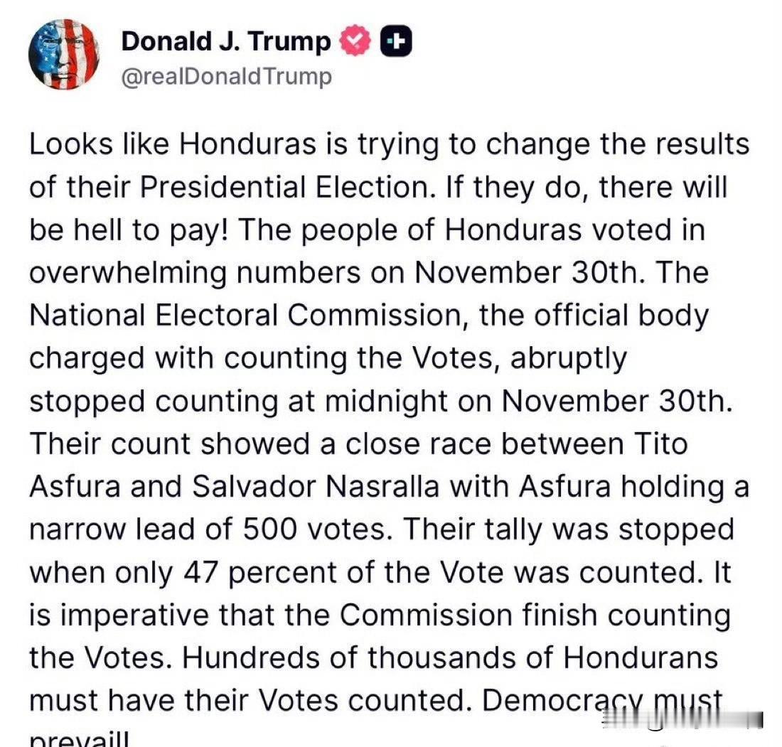 💥突发新闻:川普总统在公开支持蒂托·阿斯富拉后,威胁洪都拉斯进行舞弊选举‼️ 川普发文:“看来洪都拉斯正试图改变总统选举结果。如果他们得逞,后果不堪设想! 11月30日,洪都拉斯人民踊跃投票。负责计票的官方机构——国家选举委员会,于11月30日午夜突然停止了计票工作。他们的计票结果显示,蒂托·阿斯富拉和萨尔瓦多·纳斯拉拉的选情胶着,阿斯富拉仅以500票的微弱优势领先。 计票工作在仅统计了47%的选票后就停止了。选举委员会必须完成计票工作。数十万洪都拉斯人的选票必须得到清点。民主必须胜利!”