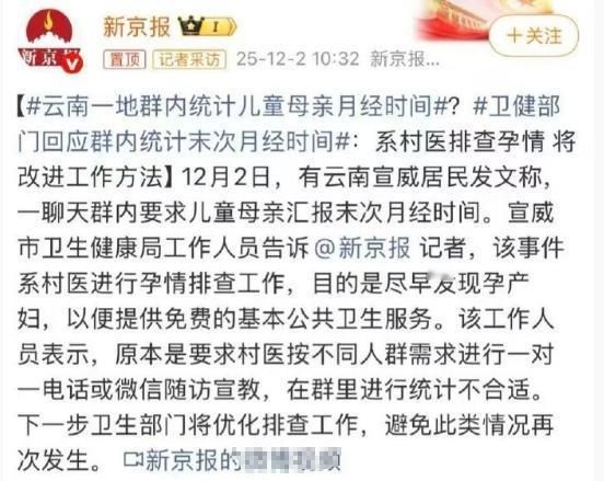 媒体报道云南某地的村医在群内统计村里妇女的月经时间,这事情也太离谱了,经过调查后发现原来是村医为了方便为孕产妇们提供更好的卫生服务,所以才做出这样离谱的事情。 只能说现在为了能够鼓励生育,大家真的是拼了,但我认为这种事情还是不要再发生了,所谓的公共卫生服务,其实不如补贴钱来得更到位,至于孕产妇们需要什么医疗卫生服务,那是她们个人的选择,不需要村医在哪里瞎胡闹。