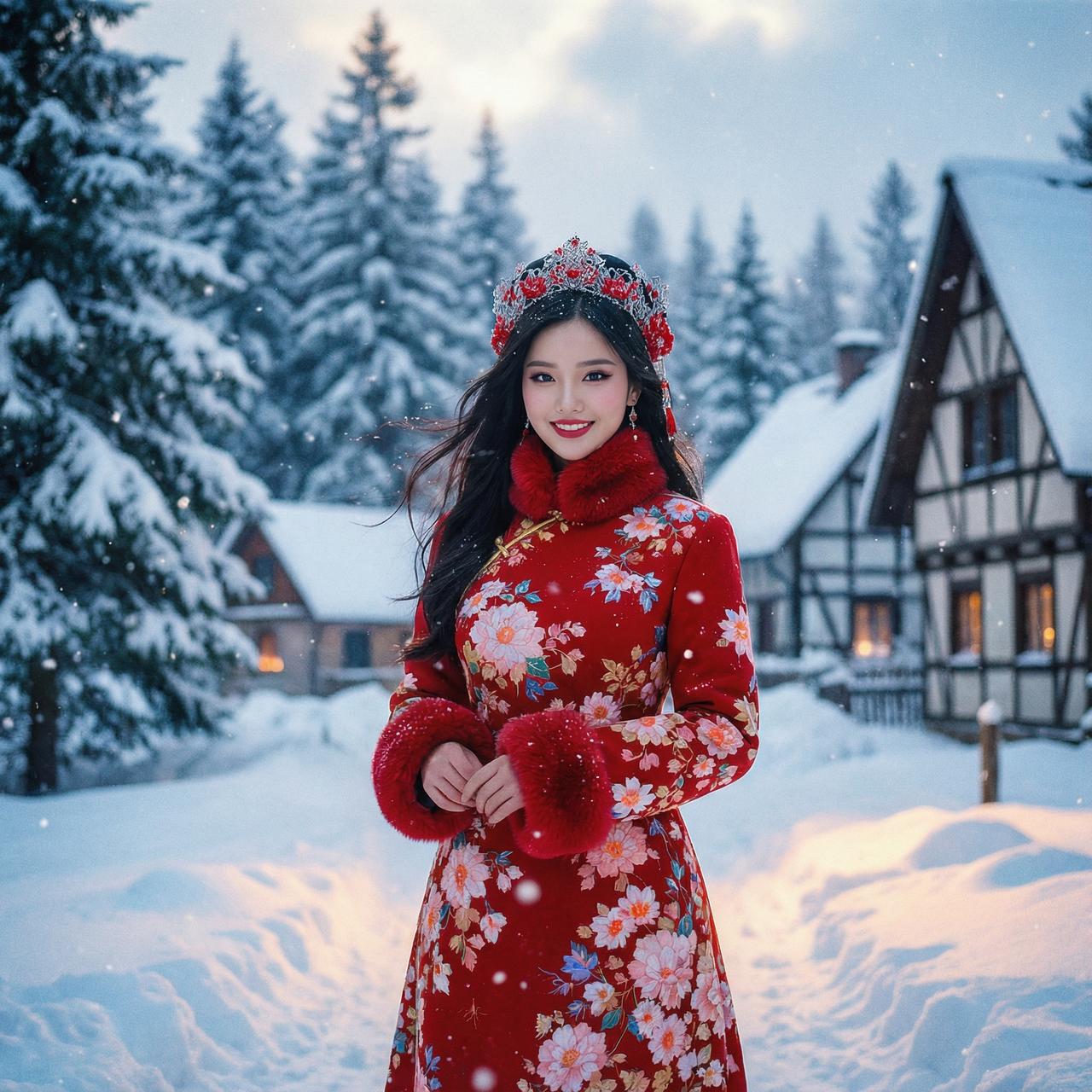 冬日暖阳下的雪景,红衣女子如画般动人。