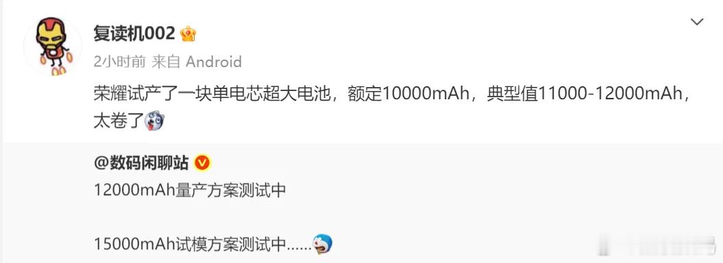 刚刚刷到博主爆料,荣耀居然在偷偷测试12000mAh超大电池的新机,目前还在调试阶段,按时间线推算大概率是明年中的荣耀X80系列要上车!12000mAh是什么概念?iPhone 17 Pro的电池还不到4000mAh,这容量直接碾压,甚至比不少充电宝、平板都要顶!以后出门根本不用揣着沉甸甸的充电宝,别说普通充电宝了,就算是20000mAh的充电宝,都不够给这手机满血充一次的。荣耀这次也是要下血本了!