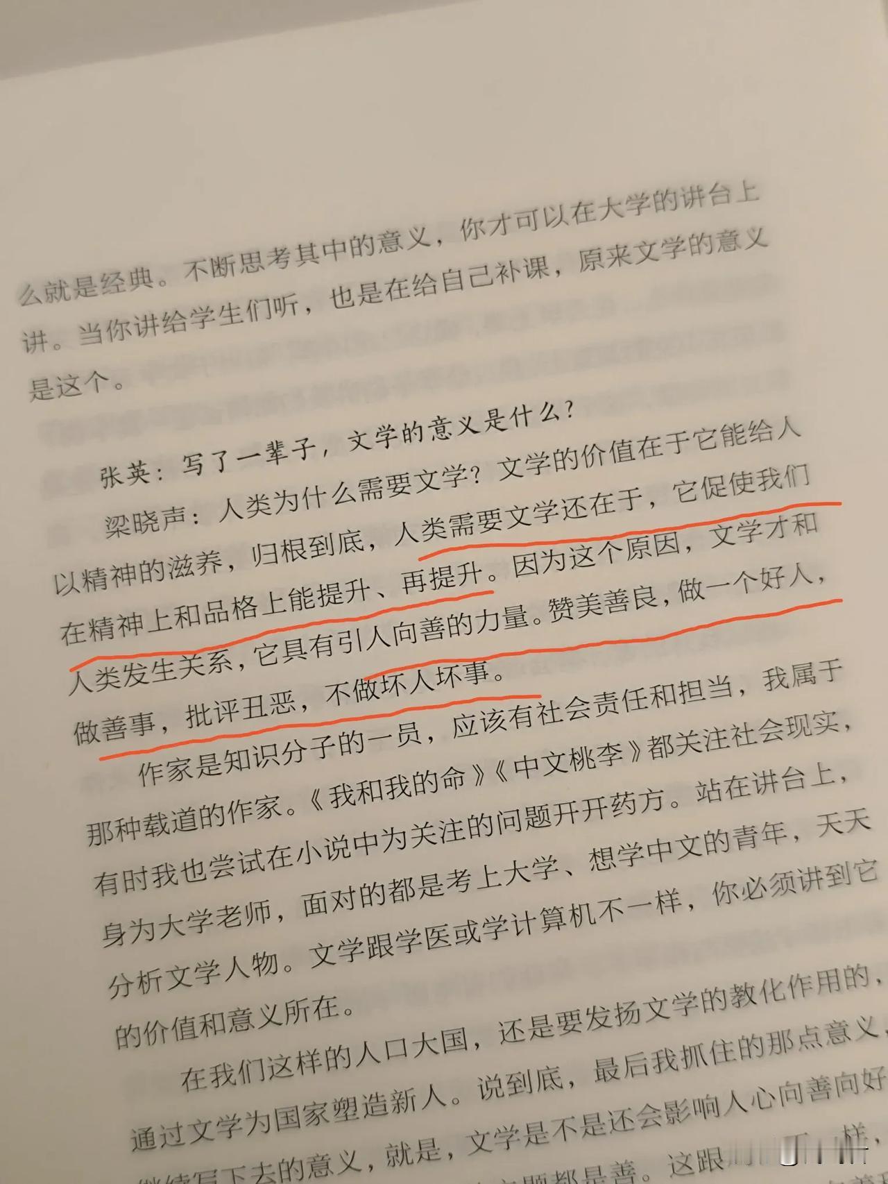 电视剧《人世间》的爆火后,也让无数了记住了作家梁晓声。 这本由小说《人世间》改编的电视剧,他写了5年,那么这本小说创作背后的故事又如何呢? 在阅读《梁晓声文学课》这本书时,不仅满足了我所有的期待,更让我对文学有了全新的认知。 书中共有7章,即七堂文学课,从访谈、杂文、随笔、问答等多元形式,用七堂课分享了作者的创作心得、写作方法、文学的价值与意义,同时也解读了王小波、鲁迅等知名作家的作品与创作风格,对于热爱文学又喜欢写作的我来说,真的是非常珍贵的7堂课。 书中最触动我的,是梁晓声对文学本质的叩问与坚守。 开篇第一页便赫然写着:“文学,即是深度思考。” 书签上的两句话更直击人心:“读书是为了低谷时心中有灯”、“读书太少,阅历太少,焦虑就多”。 这让我不禁思考:在当下社会,中文专业常因 “毕业后难找到高薪工作” 被戏称为 “女儿国专业”,不少人质疑文学学习的意义? 但梁晓声认为:“文学改变不了一个人的命运,但它可以改变一个人。“ 可见,文学与自己的成长关联,文学是人类精神的避难所,文学能让自己活得更美好。 作者在谈《人世间》创作时,也是讲作者的故事,作者想要表达自己一辈子做好人不易,不忘初心,通过这部剧呈现,普通人一辈子做到有情有义的好人,其实很不易,我们要珍惜,毕竟,太多人会在现实的打磨中渐渐偏离初心。 在谈写作如何写出好文时,作者也一直表达创作的背后,首先是一个善良的人,才能写出感动人的文章。 其中,他分享一个家长育儿的故事,在高考前,她把重要的复习资料借来,然后给孩子做,结果孩子借给同学了,于是家长很生气,便教育孩子,她认为同学之间是竞争关系,借给同学后,成绩就有可能会被超越,那么有你就没我。 作者认为家长太过功利的教育孩子,孩子会失去感知善良、珍视友情的能力,孩子也不可能写好作文,即使文字再华丽也是虚伪的,同时也会影响孩子的心理健康。 这本书还谈了很多,对于文学的理解,不仅仅是我们的精神食粮,还有人生价值与意义,以及关于自己、做人的良知等。 读完这本书,我对文学的认识有了更深入的理解,作者也希望我们多读经典,经典作品不仅仅是当时时代背景的原因,还有作者想借助小说,像一面镜子一样,或同情,或呐喊,或打动我们,或给我们一些深度思考,来唤醒我们。