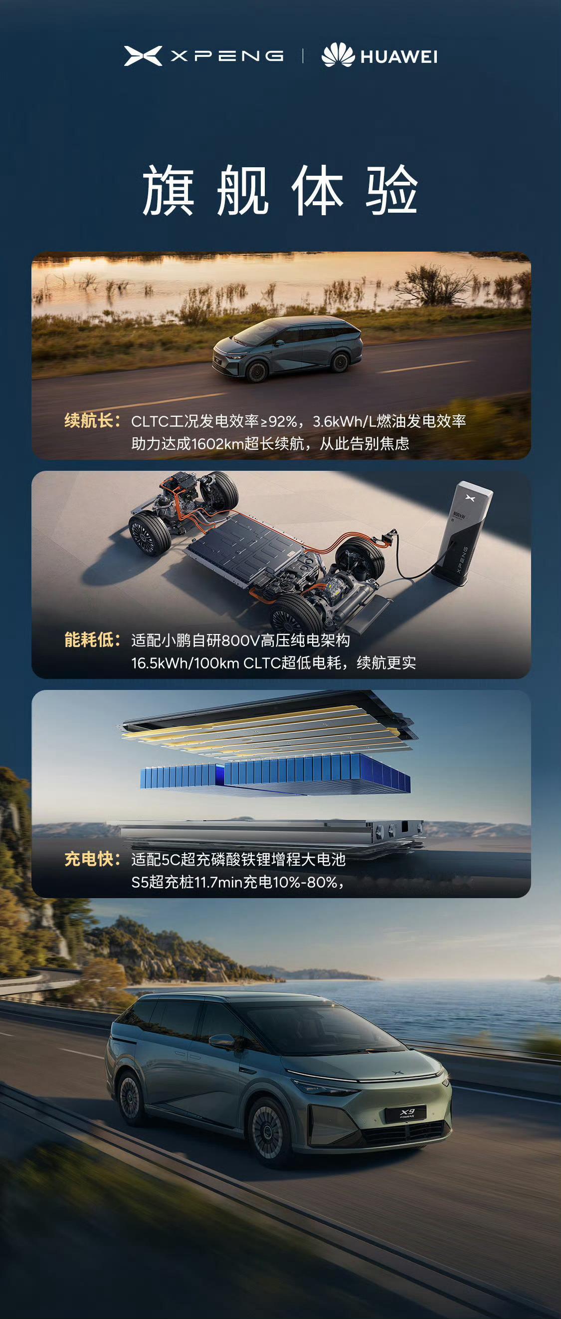 小鹏X9增程版全球首发华为DriveONE下一代增程发电机,适配800V高压平台,实现无感启停与超级静谧,CLTC续航高达1602km,充电10分钟补能313km续航。小鹏&华为,强强联手小鹏X9联手华为推出下一代增程发电机