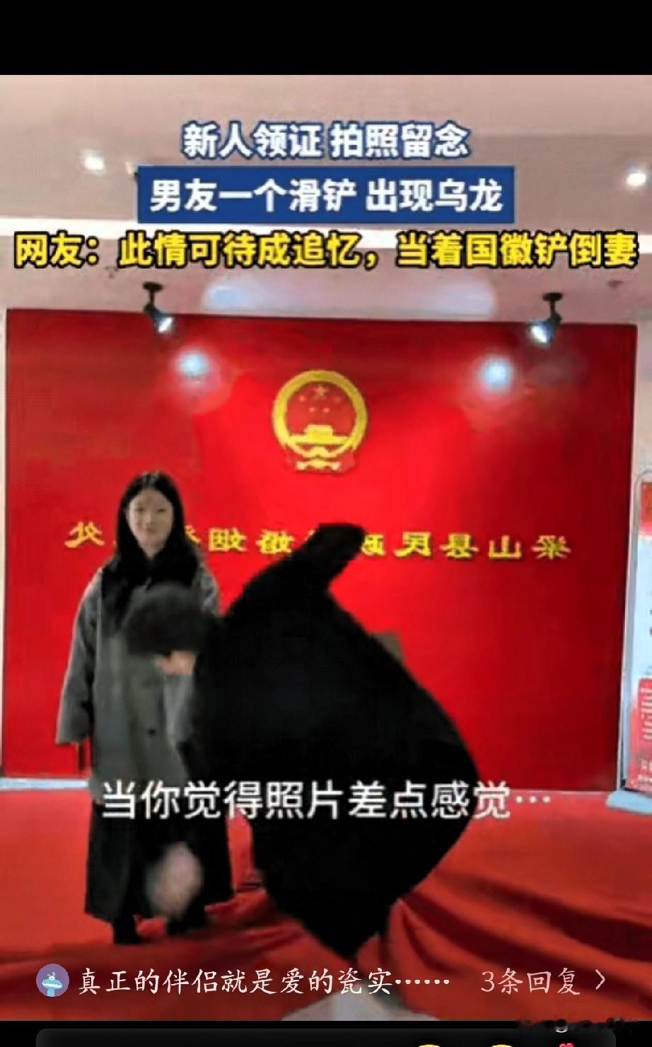 全网都笑喷了:山东,一对情侣在民政局刚领完证,想着一起来个合照。 结果小伙因为心情太激动,抬脚往前挪的瞬间没站稳,趔趄着滑倒在地,还顺带把身旁的女友也带倒了。两人一个轻捂着手腕、一个揉了揉膝盖,懵懵地对视几秒后又忍不住笑出来的模样,被镜头全程记录,视频发出后,网友们纷纷留言调侃,相关话题也悄悄登上了本地热搜。 评论区里满是轻松的吐槽,有人打趣这是“领证先绊,日子稳当”,还有人说这是“婚前小考验,共患难的开端”,不少过来人也分享起自己领证时的小插曲,比如忘带身份证复印件、走错登记窗口之类的糗事。 但在一片笑意里,我却觉得这略显狼狈又满是甜蜜的一幕,比精心打磨的领证大片更有纪念意义。 现在很多人拍领证照,都格外追求仪式感和完美度:西装要平整、妆容要精致、姿势要反复调整,可婚姻从来不是活在精修滤镜里的理想模样。 它更像这场猝不及防的滑倒,会有突如其来的小意外,会有没预料到的小窘迫,却也藏着下意识护住对方的本能。小伙摔倒后第一时间伸手去拉女友,女孩摔懵后没埋怨反而先笑场,这份自然的包容与默契,才是往后柴米油盐日子里最踏实的底气。 我们总在憧憬婚姻的浪漫与顺遂,却容易忽略它的底色本就不是永远光鲜。能在人生重要时刻笑着接纳彼此的小狼狈,能在平淡日常里接住对方的小失误,能在遇到难处时紧紧攥住对方的手,这才是婚姻最真实也最珍贵的模样。 那些看似“小翻车”的瞬间,从不是感情的减分项,反而是感情升温的催化剂,是刻在记忆里的专属温暖。